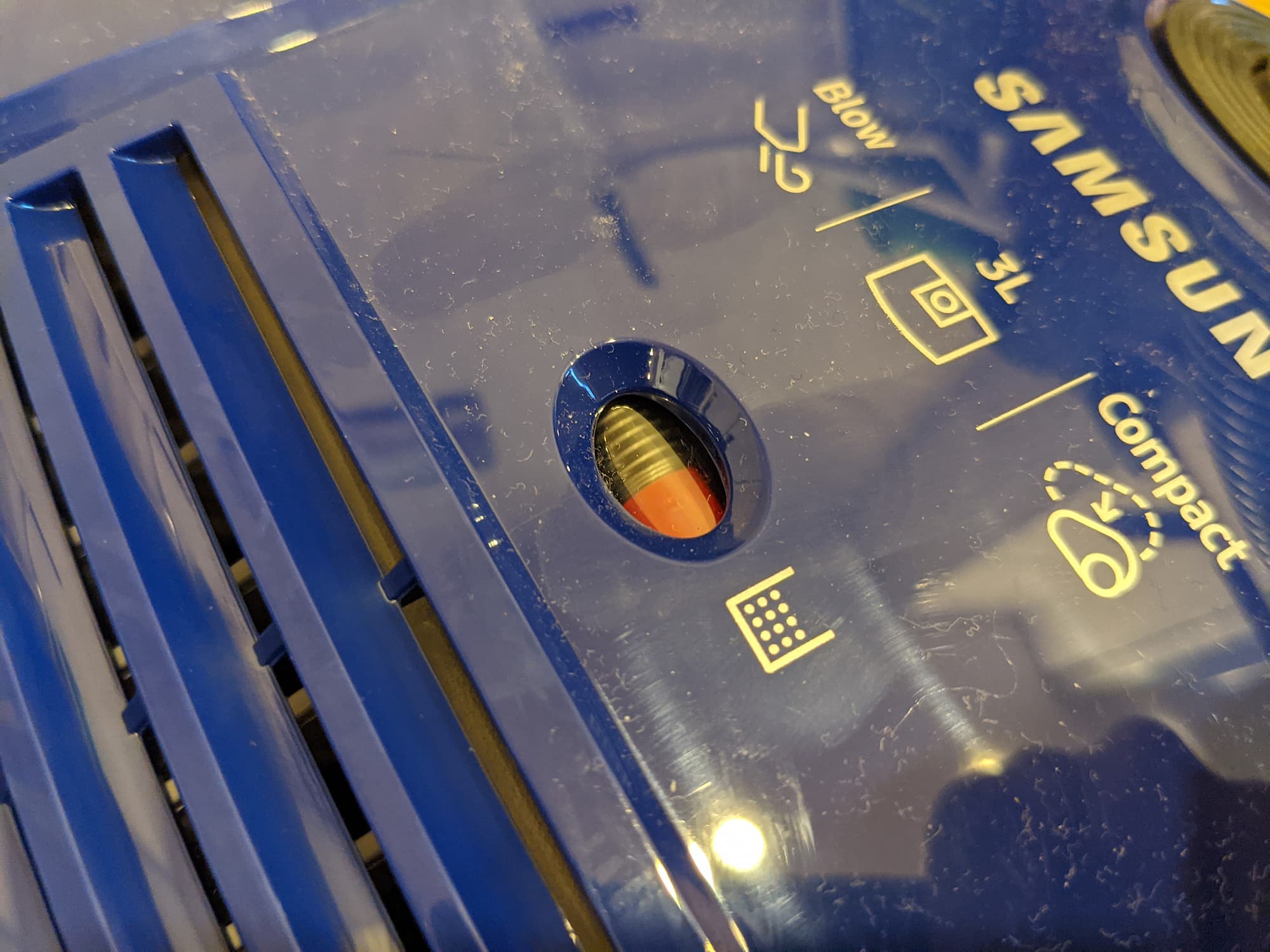 Нам понравилось, что электронная регулировка мощности у этой модели (регулятор располагается на корпусе) плавная и большого диапазона, причем дополнительно управлять силой всасывания можно на рукоятке при помощи механического клапана. Таким же механическим, но вполне надежным оказался индикатор заполнения пылесборника — яркий «поплавок», который хорошо виден.