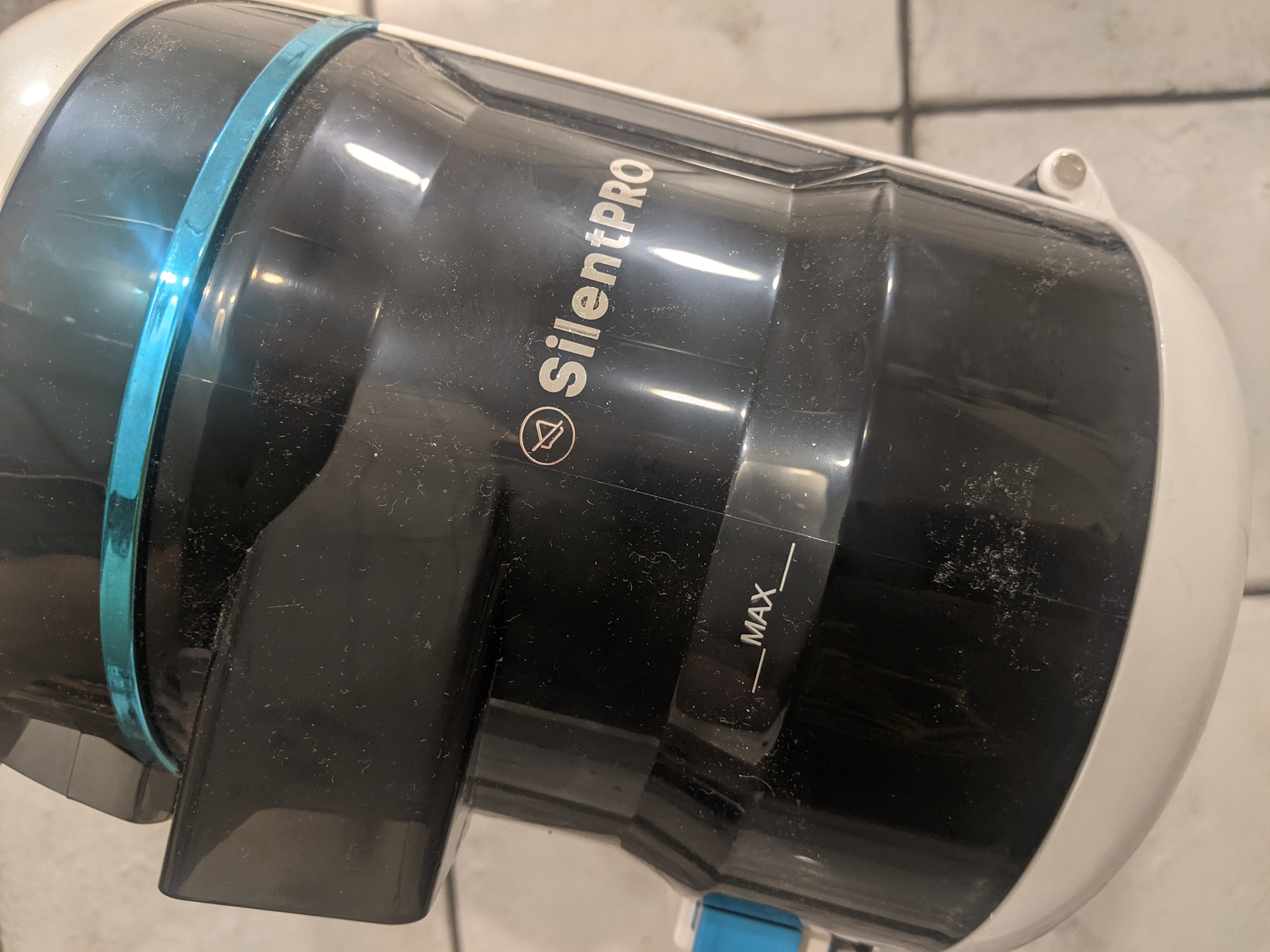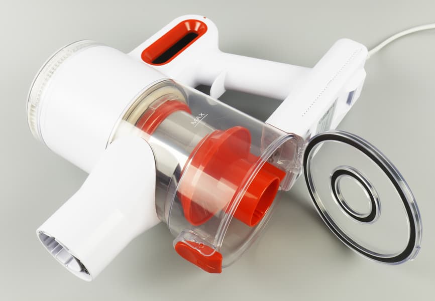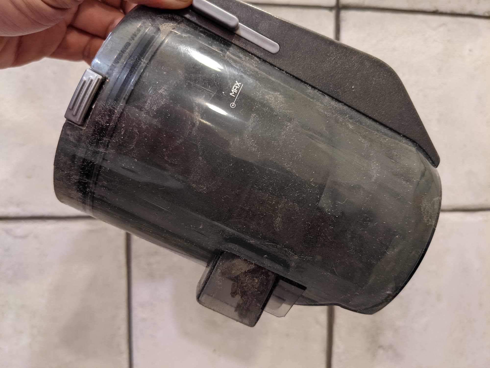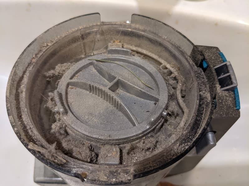 Контейнер выполнен из темного пластика, через который снова плохо видно количество мусора (да они все сговорились!) Система фильтрации пылесоса оставляет желать лучшего: не весь крупный мусор попадает в циклон из-за недостаточной мощности всасывания (наши измерения показали всего 54 аВт — как у не самых мощных аккумуляторных стиков), фильтры сильно загрязняются. Фильтр тонкой очистки при этом нельзя мыть — только вытряхивать и заменять по мере необходимости.