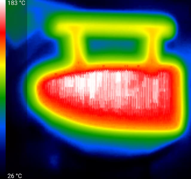 Ручка устройства остывает значительно быстрее, чем корпус, но браться за нее без защиты мы не рекомендуем: ее температура при работе превышает 100 °C.