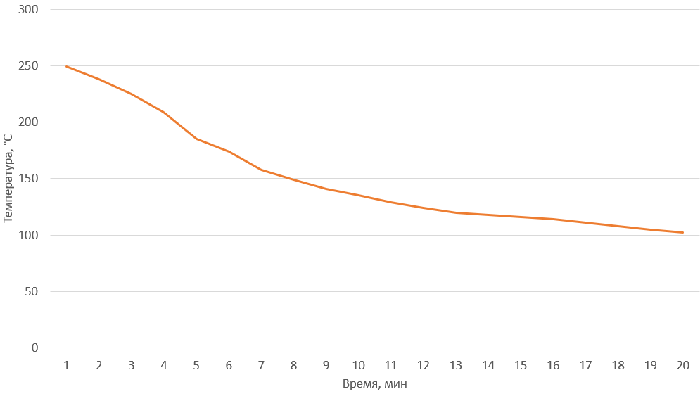 За шесть минут прибор нагрелся до 250 °C — отличный результат.