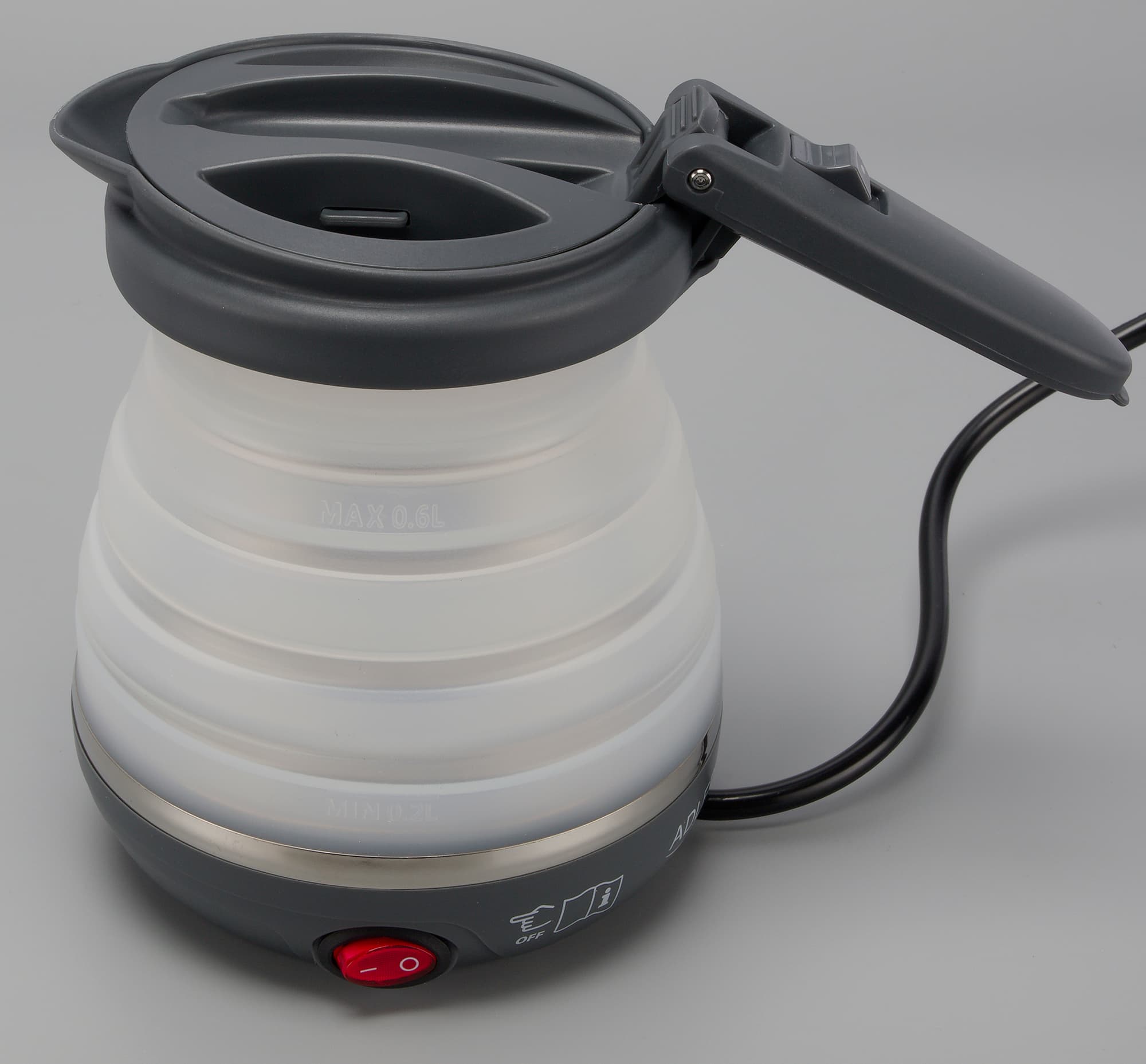 Складывается и раскладывается чайник с небольшим усилием, сделать это совсем несложно. На корпусе можно найти не слишком заметные отметки минимального и максимального уровня воды — 0,2 и 0,6 л соответственно.