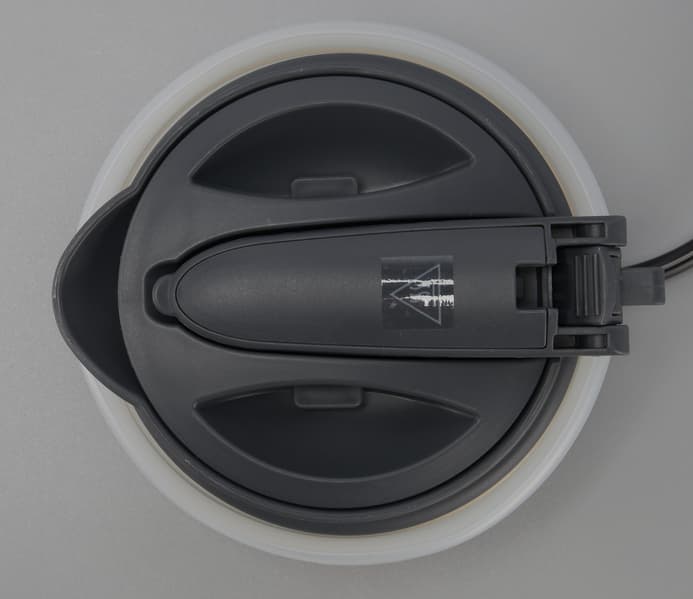 Основной материал чайника — матовый серый пластик. Отпечатки пальцев он практически не собирает, выглядит вполне достойно. В ходе эксплуатации мы обратили внимание, что случайно запачкать прибор, взяв его не слишком чистыми руками, практически невозможно. В нижней части корпуса находится декоративная пластиковая накладка, окрашенная под металл.