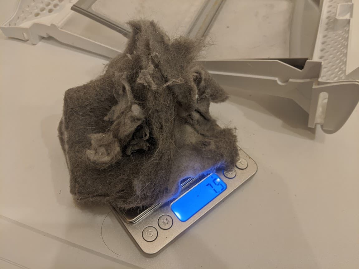 Общий вес удаленной шерсти составил 7,9 г, а войлочный комок, снятый с поверхности фильтра, едва уместился на площадке наших лабораторных весов.