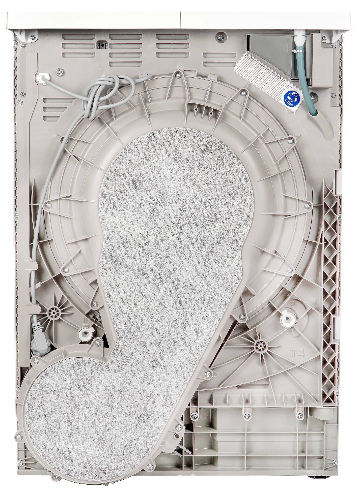 Кожух привода барабана покрыт мягкой тканью, смягчающей вибрацию при установке у стены. В верхней части задней панели можно видеть зеленоватый шланг, соединяющий насос для конденсата с горловиной сливного бака. Воду, образующуюся при сушке, можно удалять из прибора, опорожняя сливной бак вручную, а можно подключить машину к канализации, если условия установки это позволяют, и не беспокоиться о его возможном переполнении.