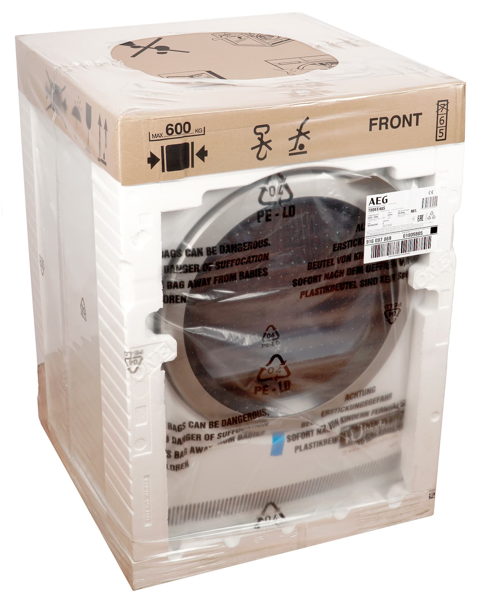 Сушильная машина прибыла к нам на тестирование в технологической упаковке, характерной для крупной бытовой техники: пенопласт, обтянутый полиэтиленом. Верх упаковки закрыт картонной крышкой с инструкциями по транспортировке. Простая, достаточно надежная и легко утилизируемая конструкция.