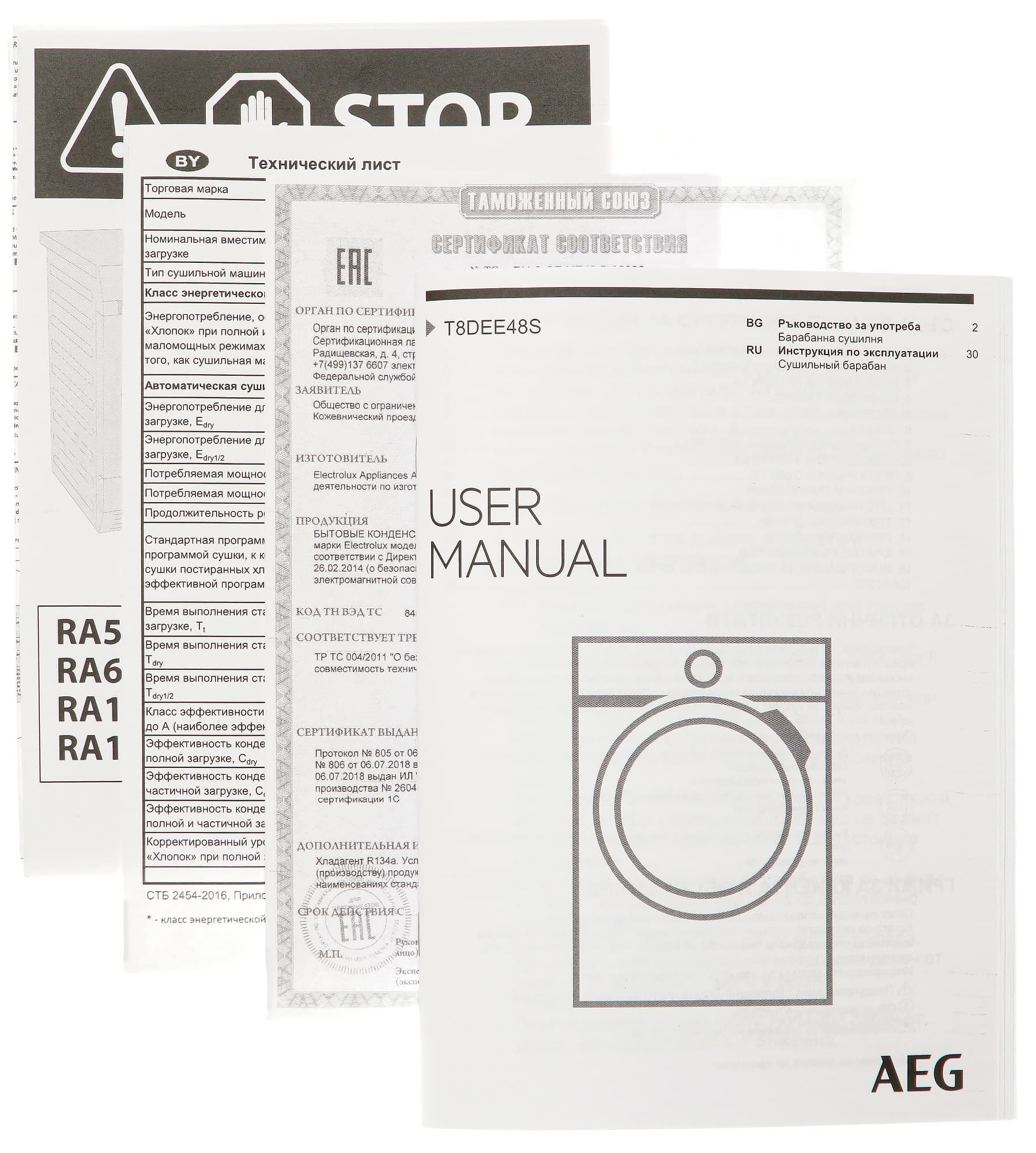 Руководство по эксплуатации сушильной машины AEG T8DEE48S — достаточно толстая брошюра на двух языках: болгарском и русском. Она напечатана на тонкой матовой бумаге, качество печати — хорошее, шрифт не слишком мелкий, схемы и рисунки не перегружены лишними деталями.