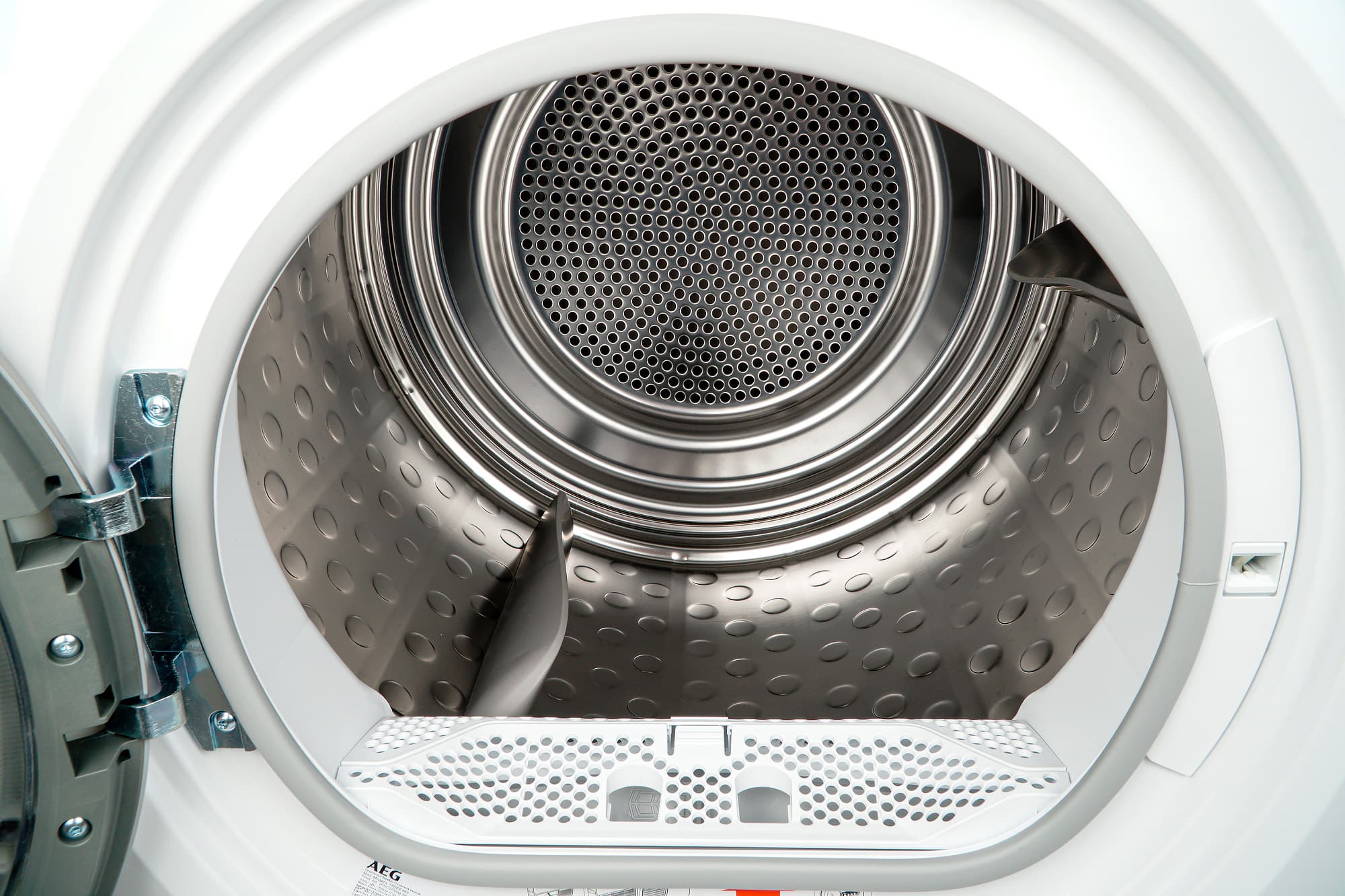 Изнутри барабан сушильной машины напоминает барабан стиралки. Отличается он расположением перфорации (здесь она находится в торце задней стенки, а не по периметру) и чуть более высокими и тонкими бойниками, способствующими перемешиванию белья, — им приходится преодолевать меньшее сопротивление, чем внутри стирального барабана, при этом перемешивание при сушке должно быть более активным.