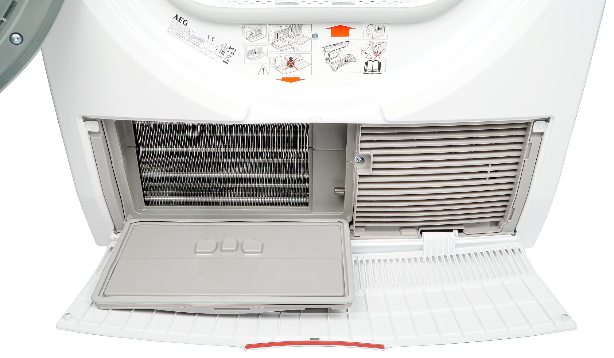 Крышка выпускного воздушного фильтра находится на передней панели. Над ней, под дверцей барабана, наклеена понятная инструкция по очистке фильтров и мерах предосторожности при работе с ними.