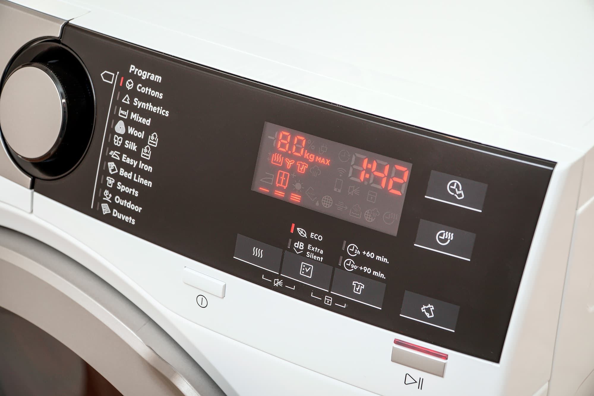 При внимательном взгляде на дисплей можно увидеть, что на нем имеются дополнительные иконки, неактивные при эксплуатации: один и тот же типовой дисплей применяется в нескольких моделях сушильных машин AEG, и некоторые опции в нашей версии сушки отсутствуют. К примеру, в T8DEE48S нет управления со смартфона и обработки паром: эти функции есть, вероятно, у более старших моделей линейки.