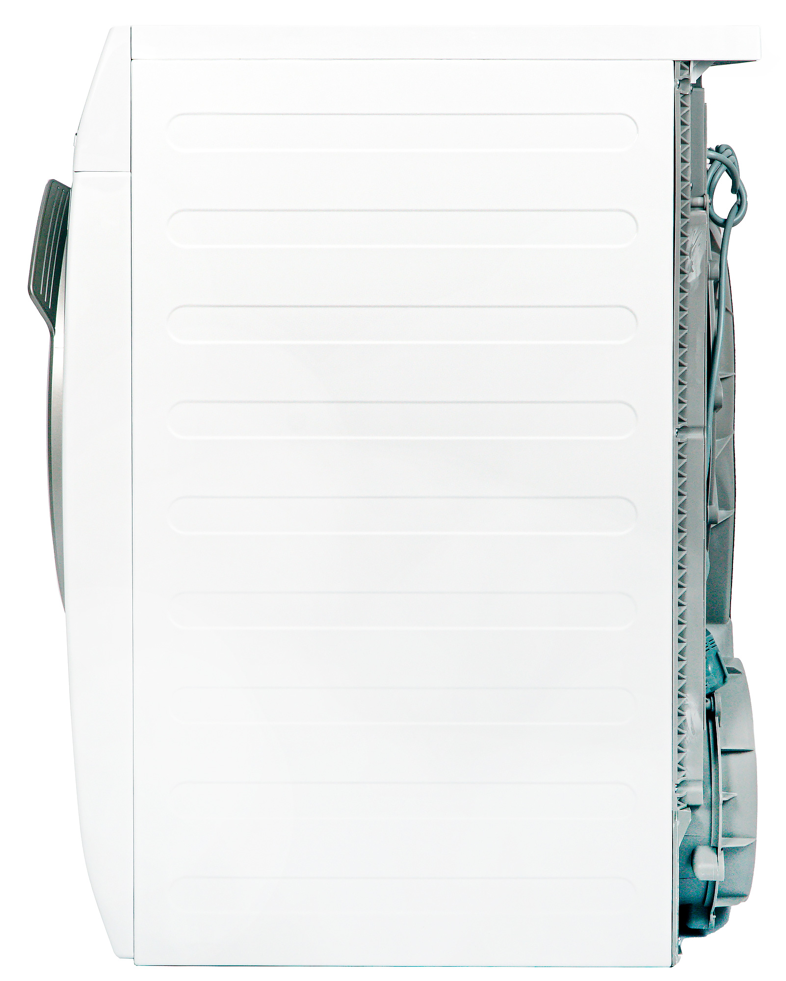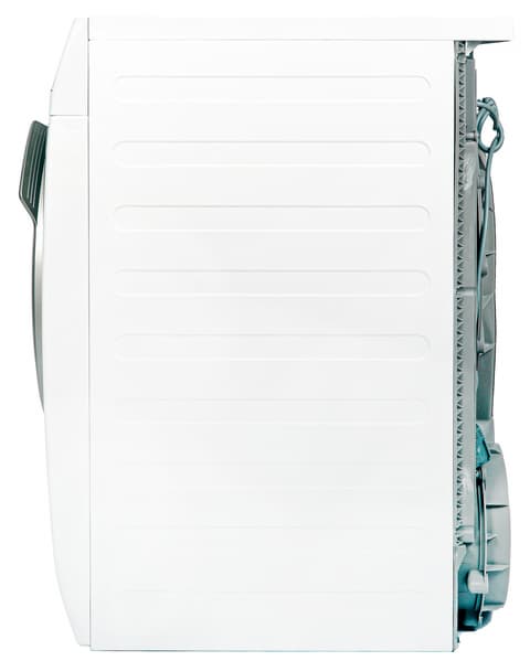 Боковые стороны сушильной машины украшены штампованными ребрами жесткости в форме вытянутых прямоугольников. При взгляде на сушилку в профиль можно видеть, что кожух электромотора сильно выдается назад, а его стенка находится на одном уровне с задним торцом верхней крышки устройства: установить его можно вплотную к стене.