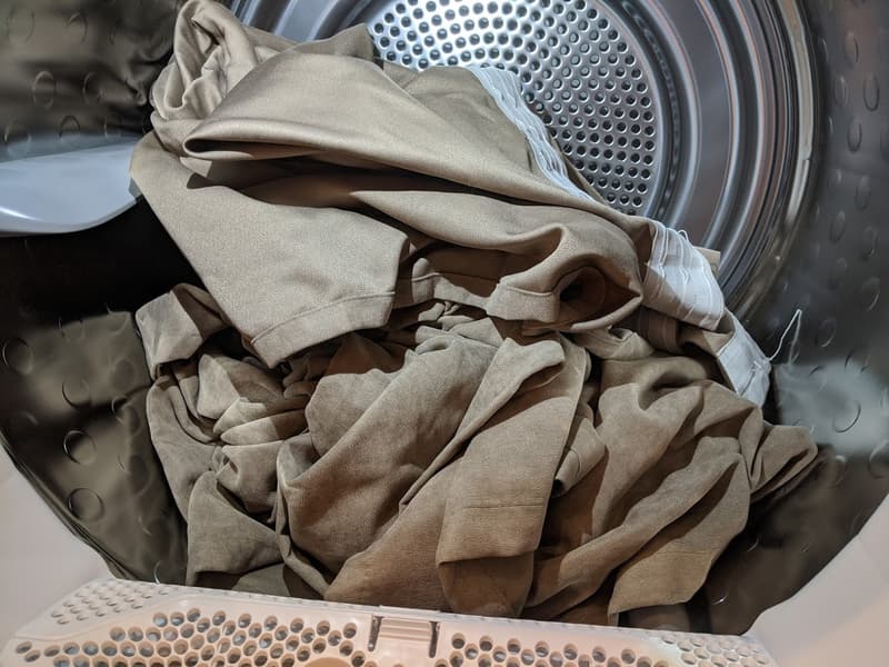 В этом тесте нас интересовало, как сушильная машина справится с большими, но тонкими кусками ткани. Сняв с окон две плотные шторы из смесовой ткани размером примерно 3 на 3 метра и общим весом в 2,7 кг, мы постирали их, отжав при 800 оборотах в минуту, и поместили в сушильный барабан на программе для синтетики.