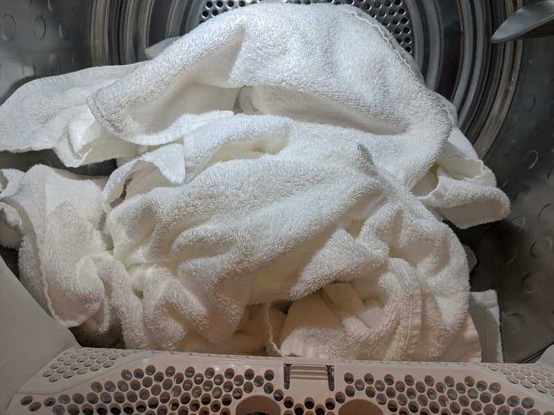 Для следующего теста мы использовали тот же комплект полотенец, отжатых на 1400 оборотах в минуту, и запрограммировали машину на максимальную сушку.