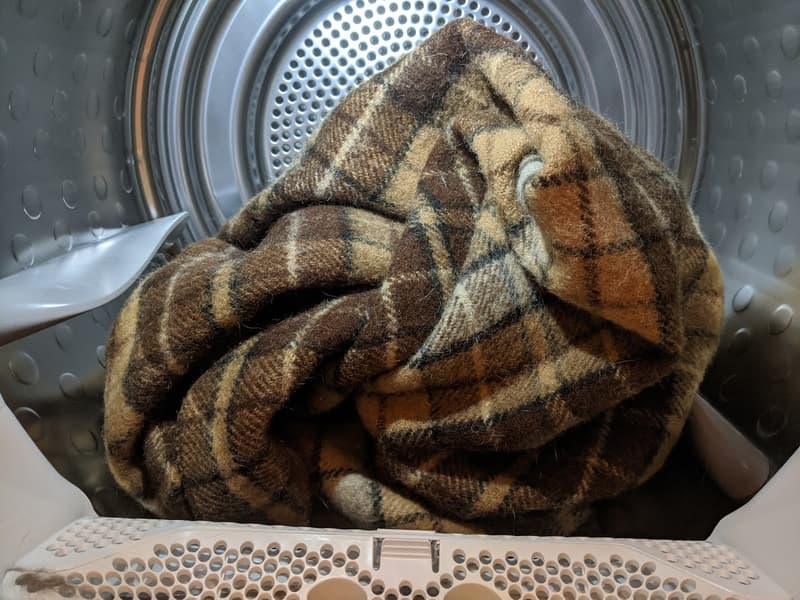 Чтобы проверить, как сушилка обращается с шерстяными изделиями, мы взяли большой плед из натуральной верблюжьей шерсти весом, чуть превышающим максимальную (1 кг) загрузку машины, постирали его, отжали в щадящем режиме и поместили в барабан тестируемого прибора.