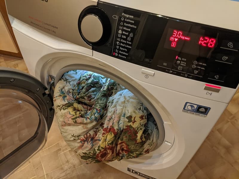 Чтобы проверить, как сушильная машина справится с объемным изделием, мы взяли большое зимнее двуспальное одеяло из хлопка с толстой синтепоновой набивкой, прополоскали его, включив отжим в 800 оборотов в минуту, и отправили в тестируемое устройство на соответствующем режиме.