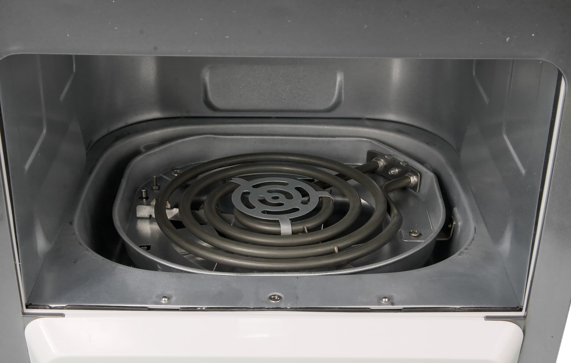 Внутренняя камера изготовлена из металла, в верхней части расположен спиралевидный нагревательный элемент. Закреплен он надежно, без люфтов и возможности сдвинуть. Над спиралью видны лопасти вентилятора.