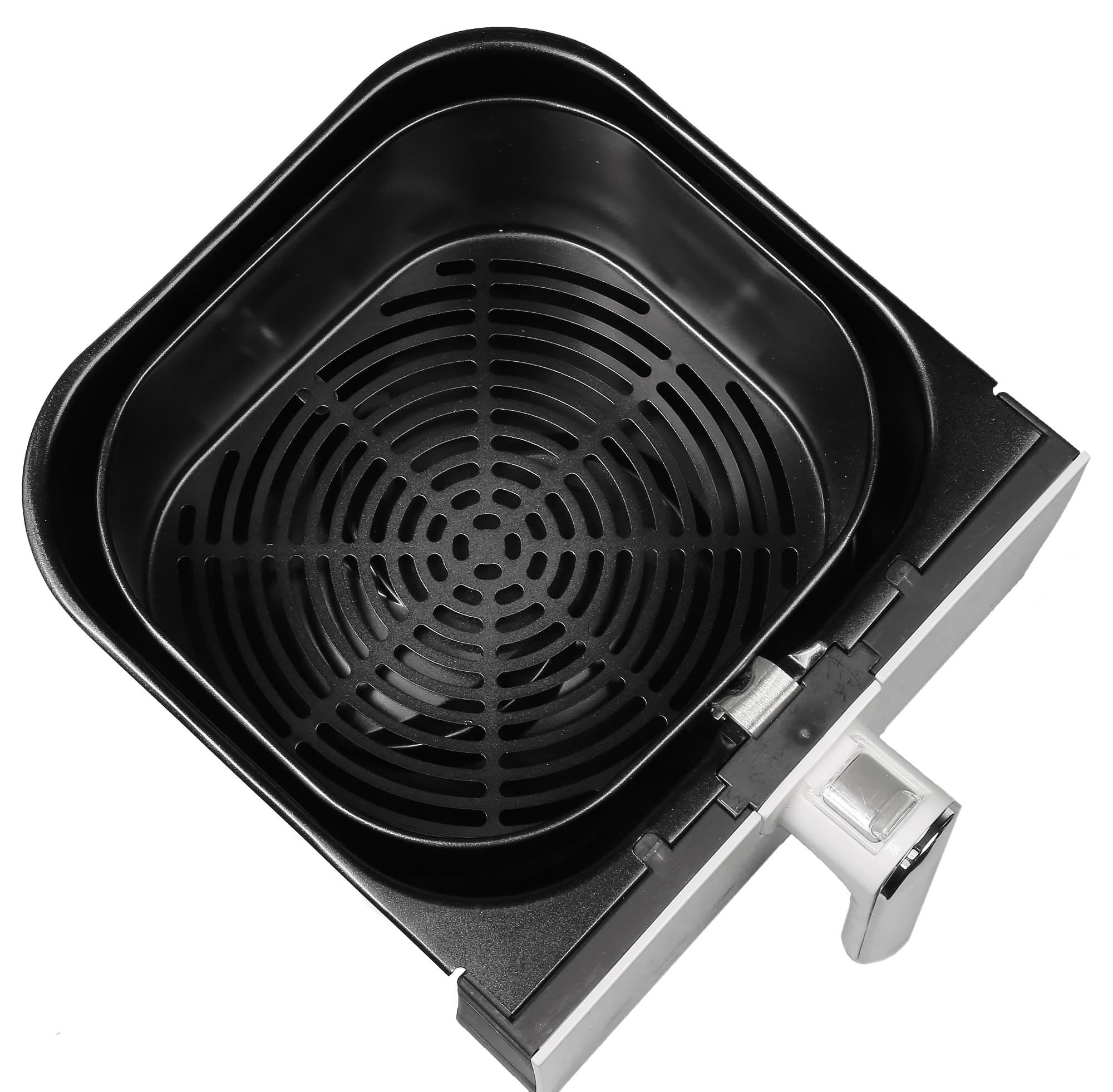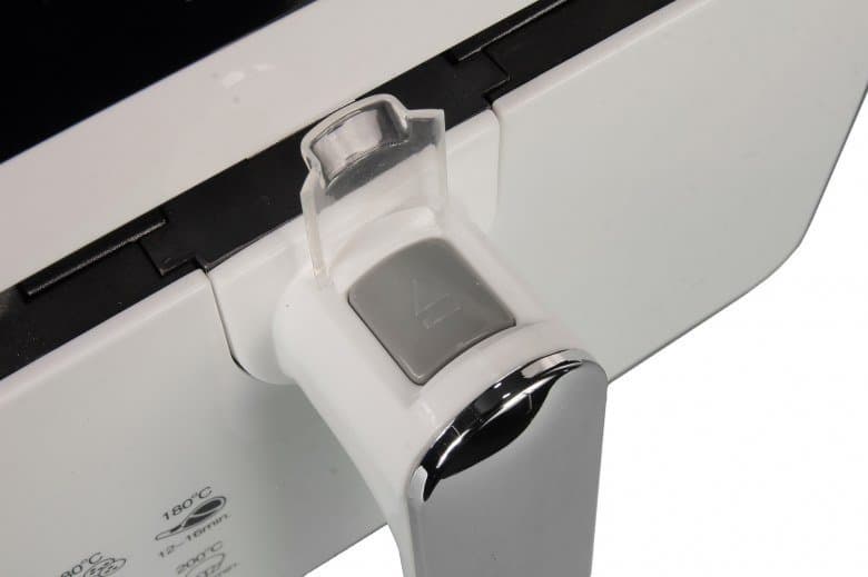 Из рабочей камеры чаша и корзина извлекаются единой конструкцией. Чтобы достать корзину с готовым продуктом, нужно приподнять прозрачную пластиковую крышечку и нажать на кнопку разблокировки. Фиксатор отщелкивается, и корзина свободно вынимается.