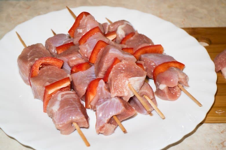 Небольшие кусочки замаринованной мякоти бедер индейки были нанизаны на шпажки. Чередовали мясо птицы с небольшими кусочками болгарского перца.