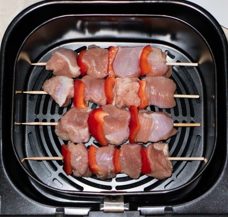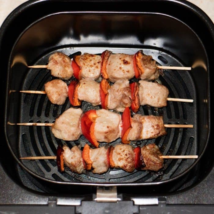 Следующую порцию обжаривали 10 минут на 200 °C. Результат был тот же — хорошо поджаренные кусочки птицы без подгорания. Снимались шпажки с содержимым без усилий, ни один шашлычок не пригорел и не прилип к поверхности корзины.