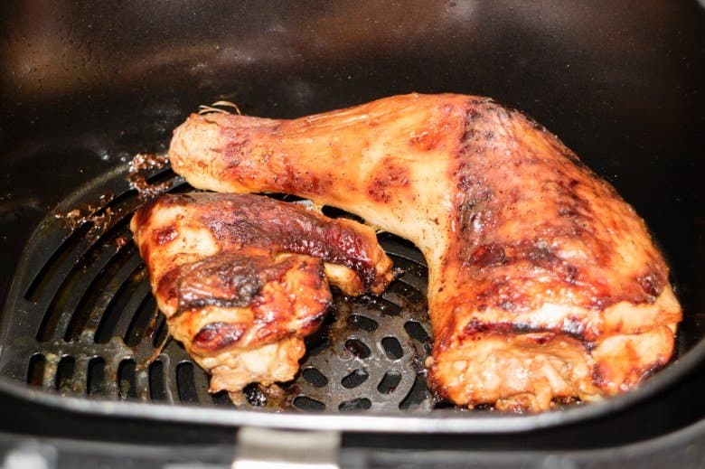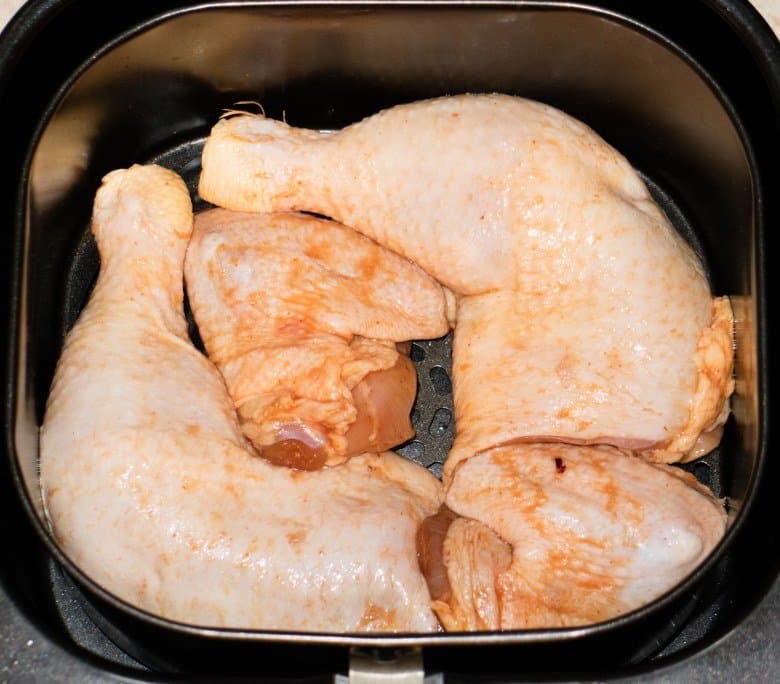 Два окорочка и два крыла без нижней фаланги были на сутки замаринованы в смеси соевого соуса и острого соуса Шрирачи. Уложили кусочки курицы на ничем не смазанную решетку. Запекали 15 минут на 180 °C. По истечении времени достали корзину. Курица показалась нам недостаточно прожаренной внутри, несмотря на коричневую шкурку. Поэтому установили 140 °C и продолжили запекать в течение еще 10 минут.
