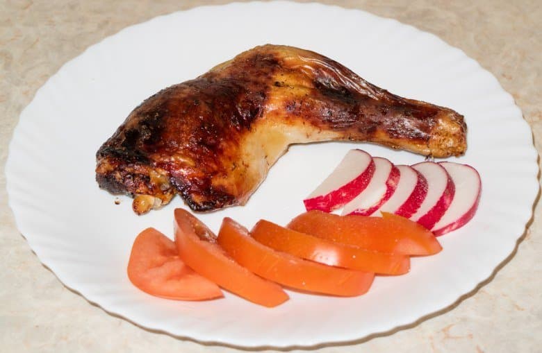 Добавленного времени оказалось достаточно для качественного и полного прожаривания крылышек и голеней. Мясо внутри самой широкой части бедер рядом с костями, на наш вкус, показалось все же слегка сыроватым.