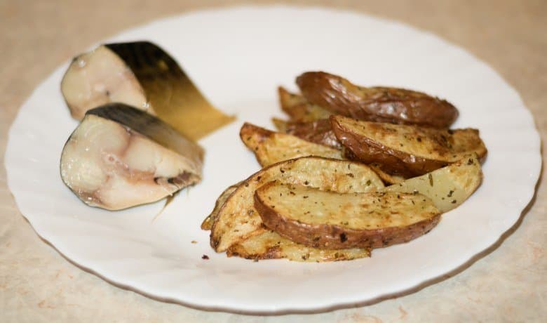 В итоге картофель отлично приготовился внутри и поджарился снаружи. Ломтики со всех сторон приобрели коричневатый оттенок и запеченную корочку. Гарнира хватило на двух человек.