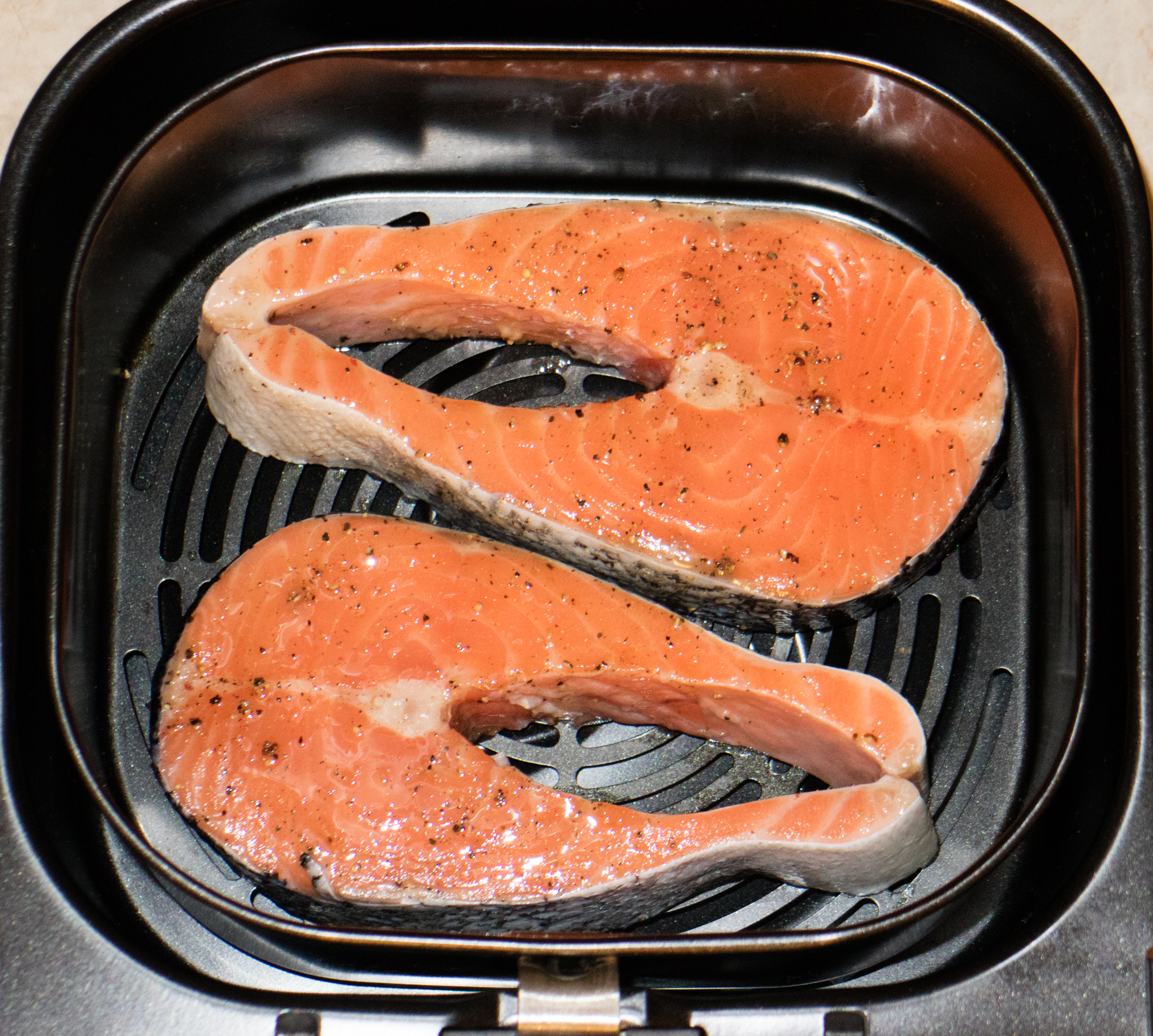Кусочки атлантического лосося посолили, поперчили, смазали растительным маслом. В корзину вместилось ровно два крупных стейка.