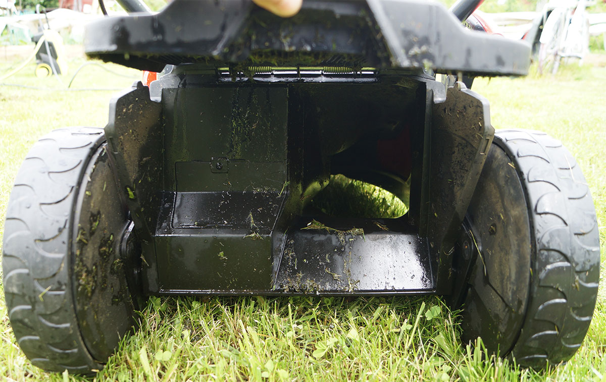 Однако этой щели может оказаться недостаточно, чтобы трава свободно покидала поддон с ножом, не скапливаясь внутри. Особенно если трава густая и влажная. Мы неоднократно сталкивались с тем, что двигатель глох от перегрузки и нам приходилось вычищать внутренности от сбившейся в комья влажной срезанной растительности.