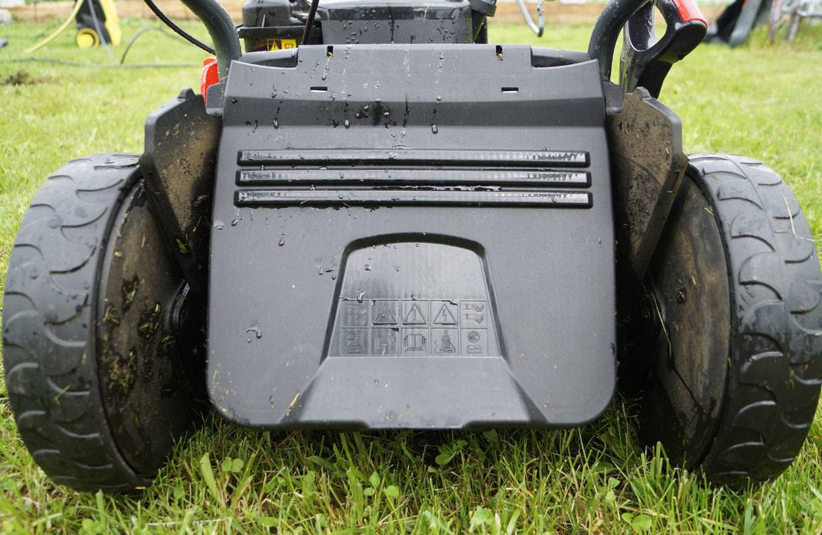 Между прочим, в ролике можно видеть, как резво стартует машина при включении колесного привода. Да, колеса начинают вращение не постепенно, а сразу на максимальной скорости. К этому нужно привыкнуть, делая шаг вперед за полсекунды до нажатия рычага хода. Скорость перемещения газонокосилки по ровной поверхности составляет примерно 3 км/ч — оптимально для спокойной прогулки. Также видно, что работать с газонокосилкой необязательно в рабочей одежде. Конструкция шахт выброса и отсекателей почти исключает попадание кусочков травы или грунта на одежду. А если применить лайфхак с крышкой травосборника, то стричь газон можно хоть в лаковых штиблетах, ни одна травинка не покусится на их блеск.