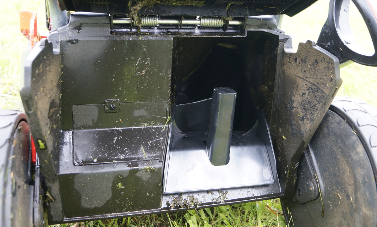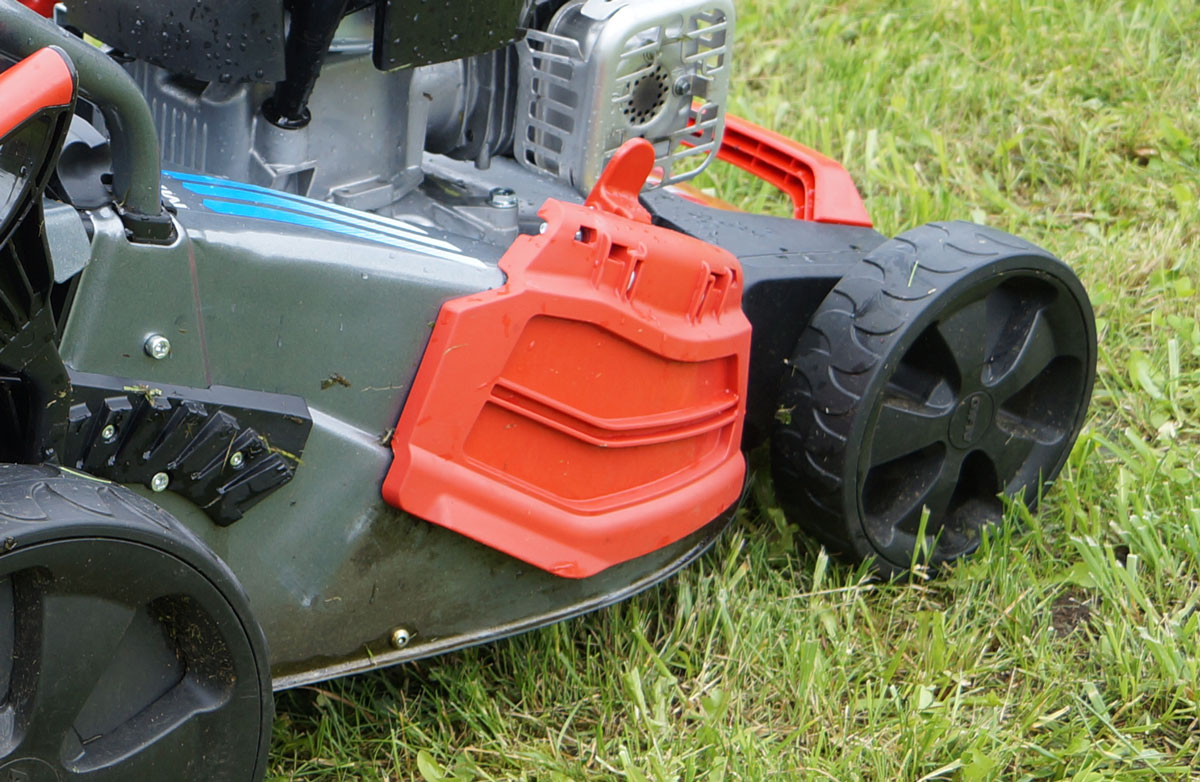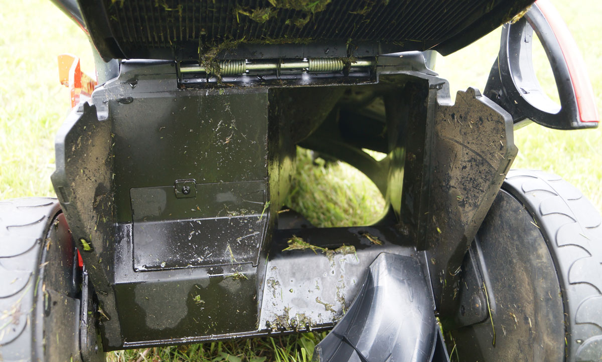 В штатном положении оба пути выброса травы прикрыты подпружиненными откидными дверцами-заслонками. И если боковая дверка наглухо запирает выход травы, то задняя заслонка оставляет небольшую щель.