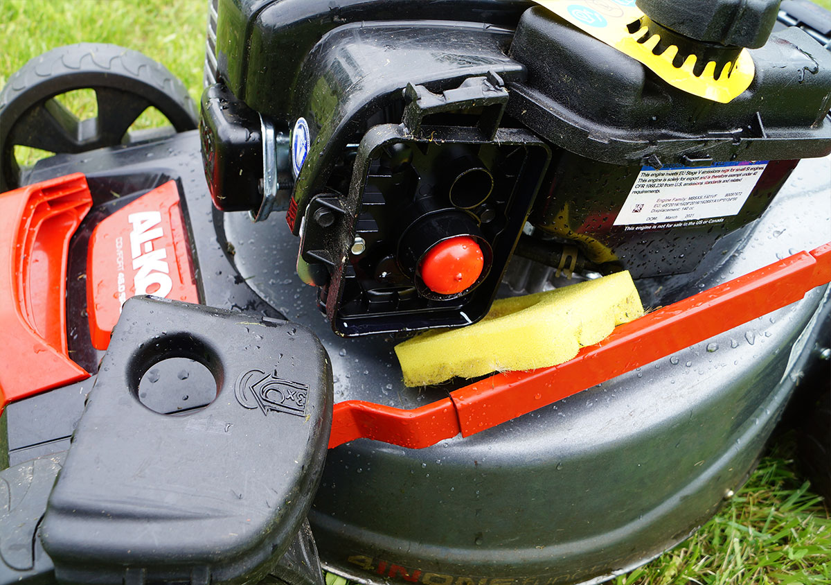 Наконец, третий узел двигателя, за состоянием которого необходимо следить: воздушный фильтр. Он расположен на отсеке карбюратора и представляет собой промасленную поролоновую вкладку, которая удерживается съемной крышкой. Этот поролон нуждается в регулярной чистке от пыли и травы, а также в промывке с последующим смачиванием в моторном масле.