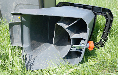 Третья защита. Задвижка мусоросборочного контейнера не только запирает его в корпусе измельчителя, но и включает электрическую цепь. И пока этот фиксатор не поднят, двигатель питание не получит. Это значит, что без установленной и запертой корзины машина работать не будет.
