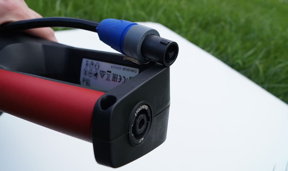 Питание кусторез получает через разъем, расположенный на торце поворотной рукояти. В этот разъем вставляется штекер кабеля, идущего от подвесной ременной системы с установленным аккумулятором.