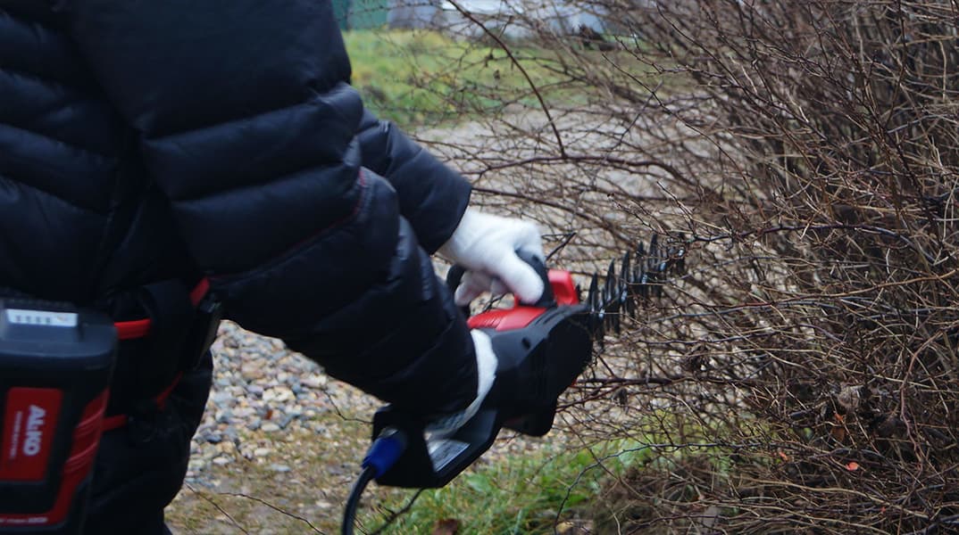 Все управление кусторезом осуществляется двумя переключателями. Первый, играющий роль блокиратора, встроен в рукоять-дугу и активируется, стоит только за нее взяться. Второй орган управления — кнопка, которой включается двигатель. Повторное нажатие кнопки меняет скорость двигателя и, соответственно, возвратно-поступательного движения режущей зубчатой пластины. Кусторез может работать в двух режимах, Eco (1200 движений в минуту) и Power (1500 движений в минуту).