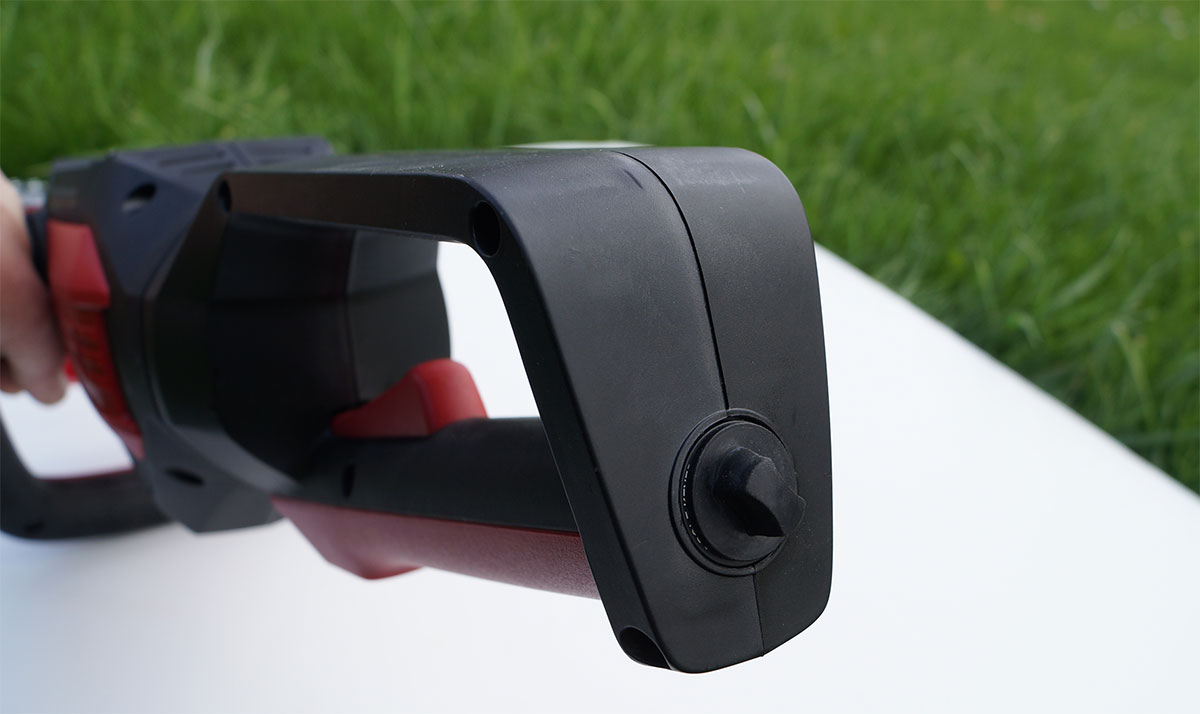 Вторая рука оператора ложится на вторую рукоять, имеющую органы управления — кнопку смены режимов и защелку-фиксатор для регулировки положения в диапазоне 180°. Такая регулировка необходима для удобства удержания инструмента при обработке всех поверхностей живой изгороди: горизонтальных и вертикальных, внизу и на высоте, ближних и труднодоступных.