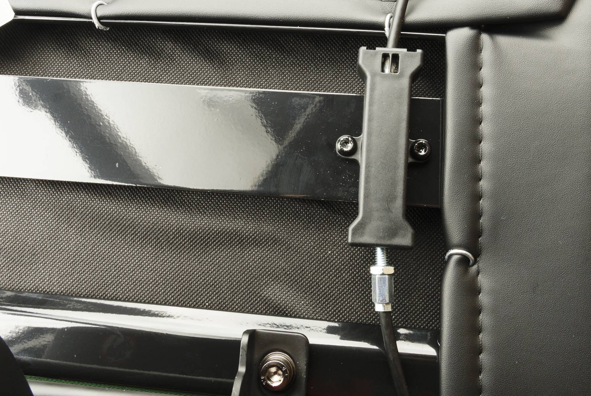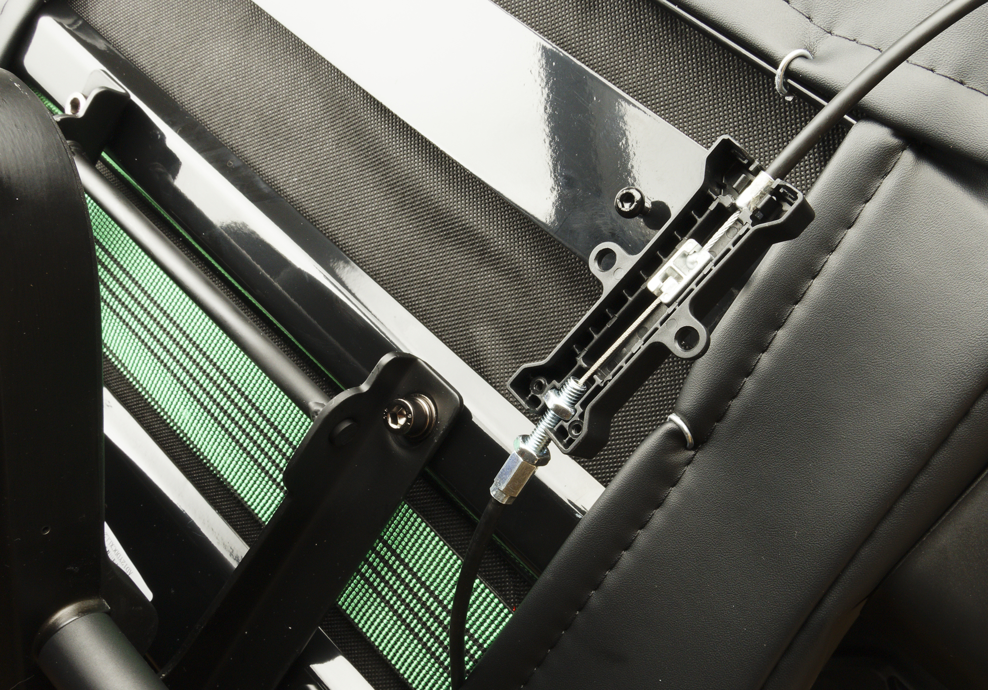 Согласно инструкции, нам следует подсоединить трос на спинке сиденья к выдвижному поясничному рычагу. Для этого нужно открыть «черный ящик», вставить шаровые концы кабеля в разъем и закрыть ящик.