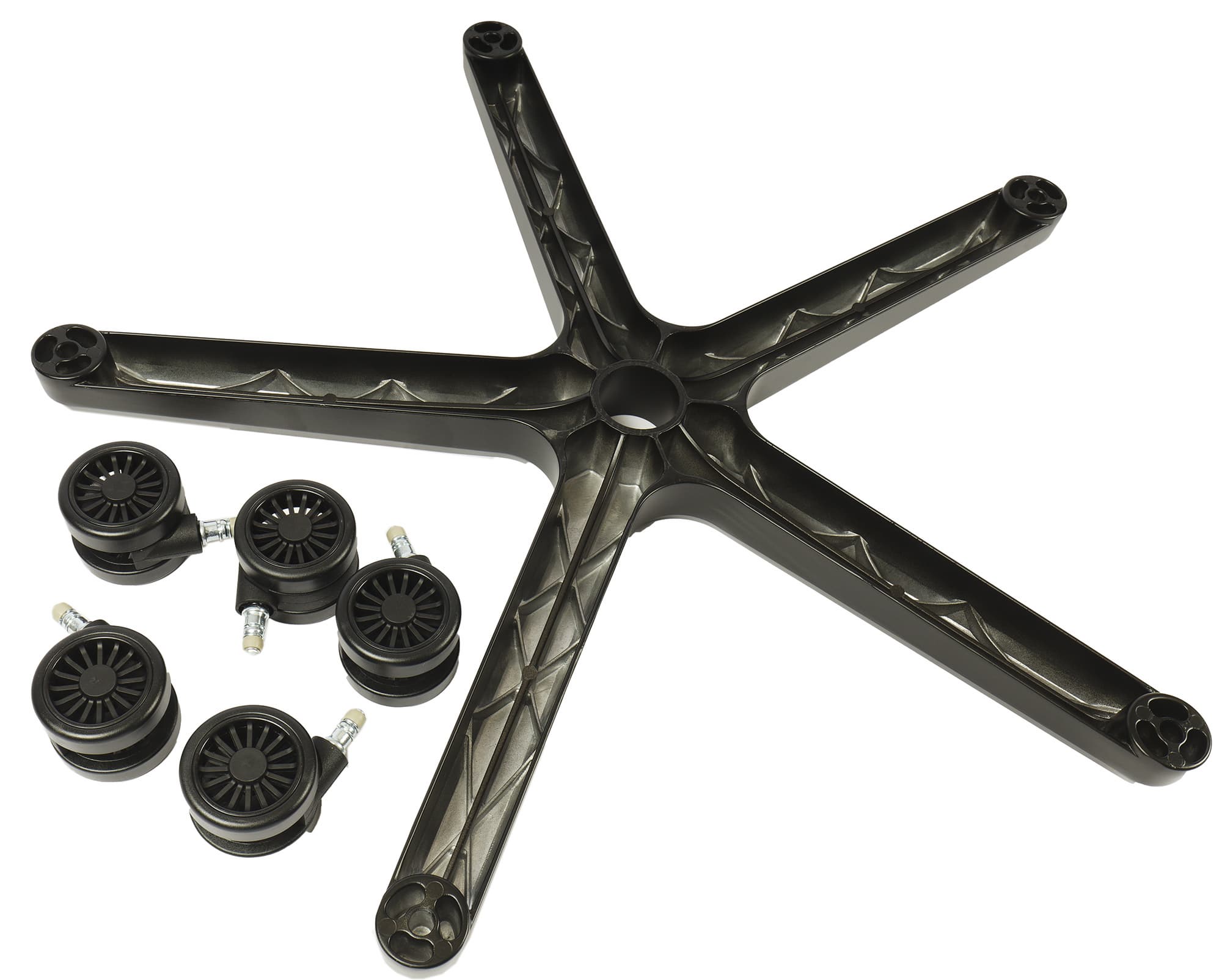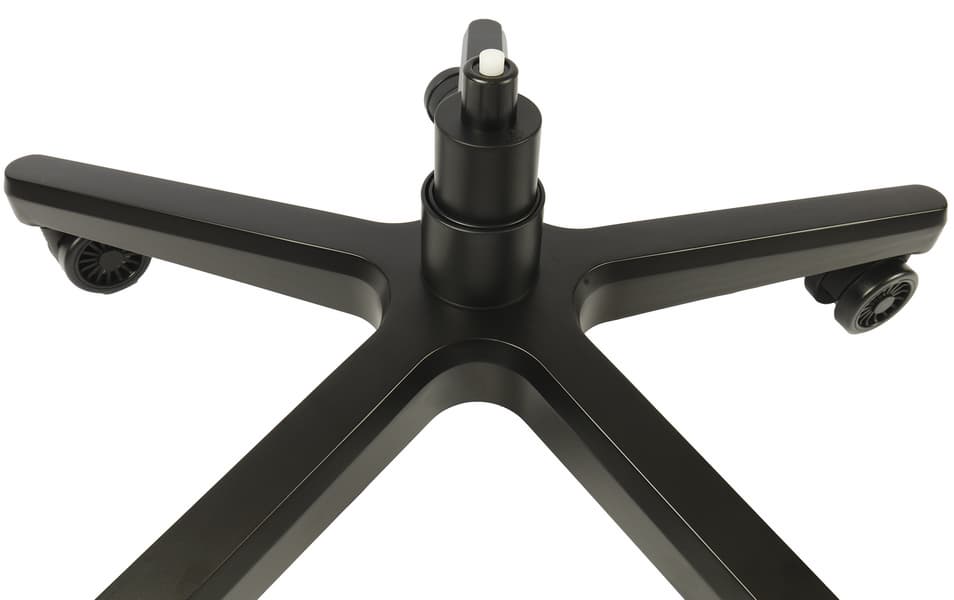 Кресло опирается на основательную пятилучевую крестовину из окрашенного в черный цвет алюминия и пять роликов диаметром 65 миллиметров с покрытием из полиуретана.