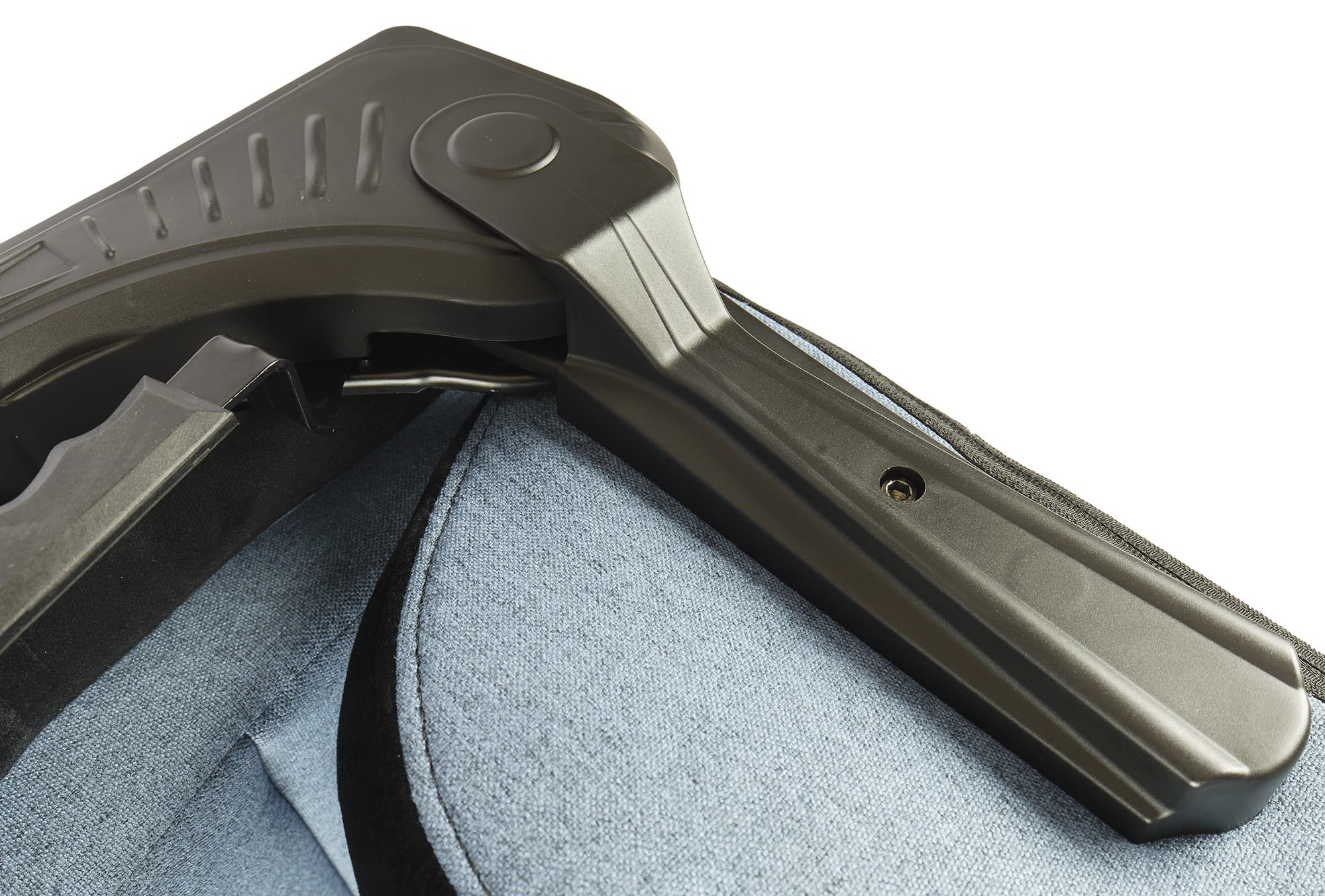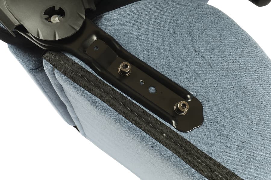 Все несъемные части сиденья обиты темно-голубой льняной тканью «под джинсу» (также производитель предлагает эту модель в сером и черном исполнениях).