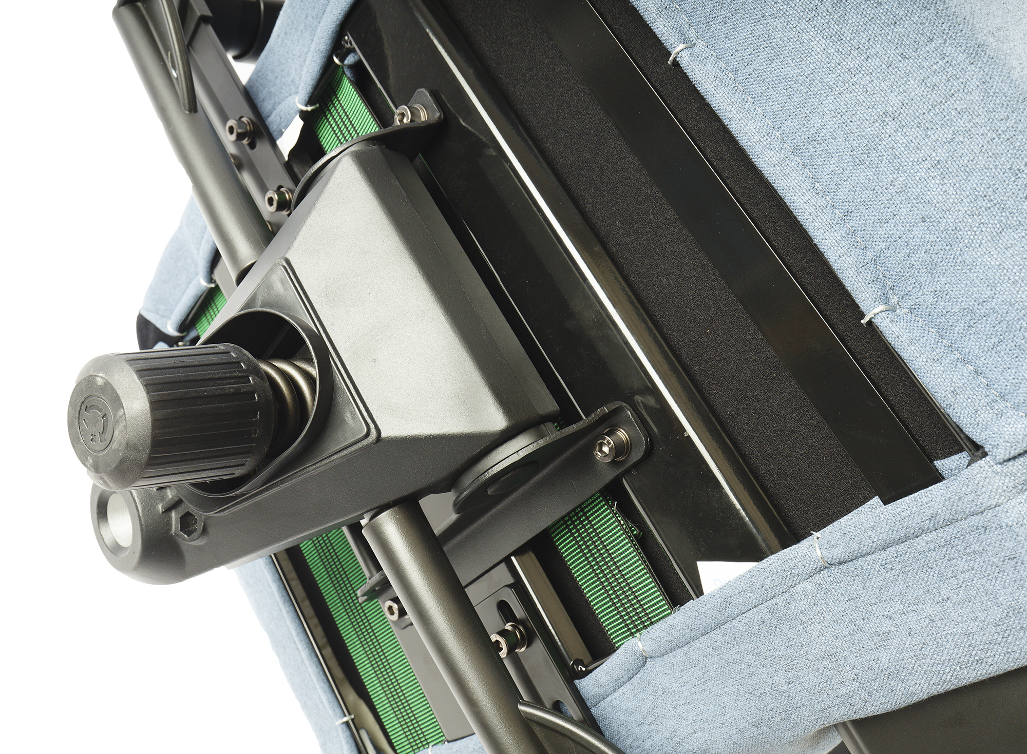 Угол наклона спинки регулируется рычагом справа от сиденья — примерно на его уровне. Зубчатый механизм позволяет установить ее в одном из пяти положений под углом от 90° до 160° к горизонтальной плоскости. Это угол между нижней частью спинки и горизонталью, а верхняя половина в крайнем положении оказывается слегка наклонена вперед.