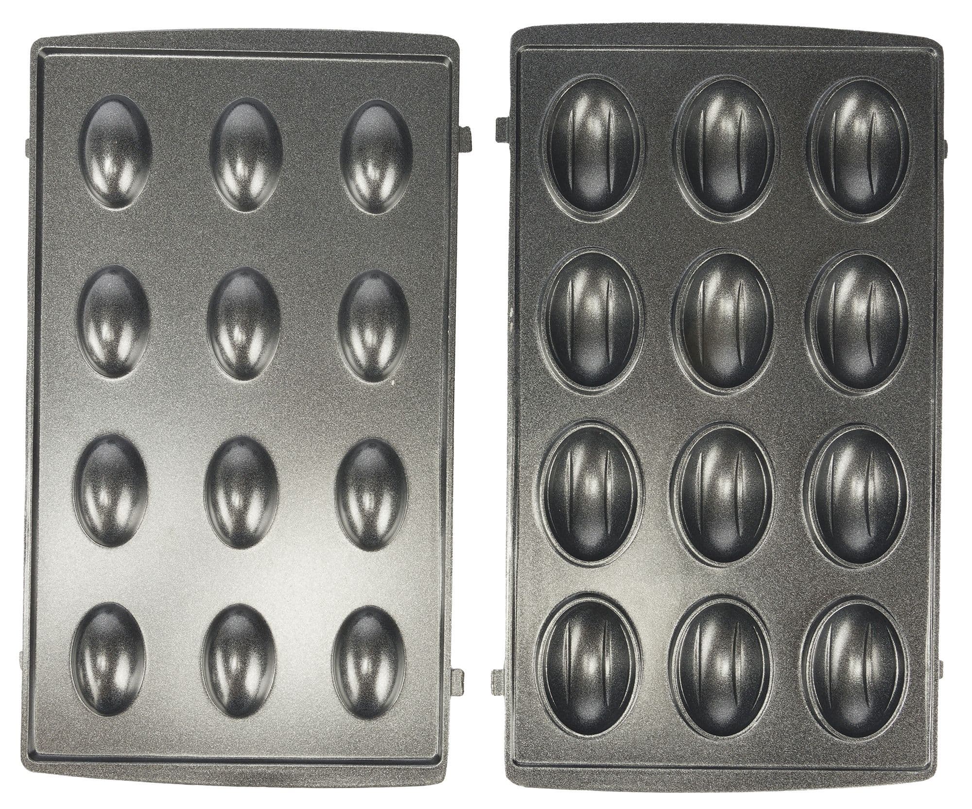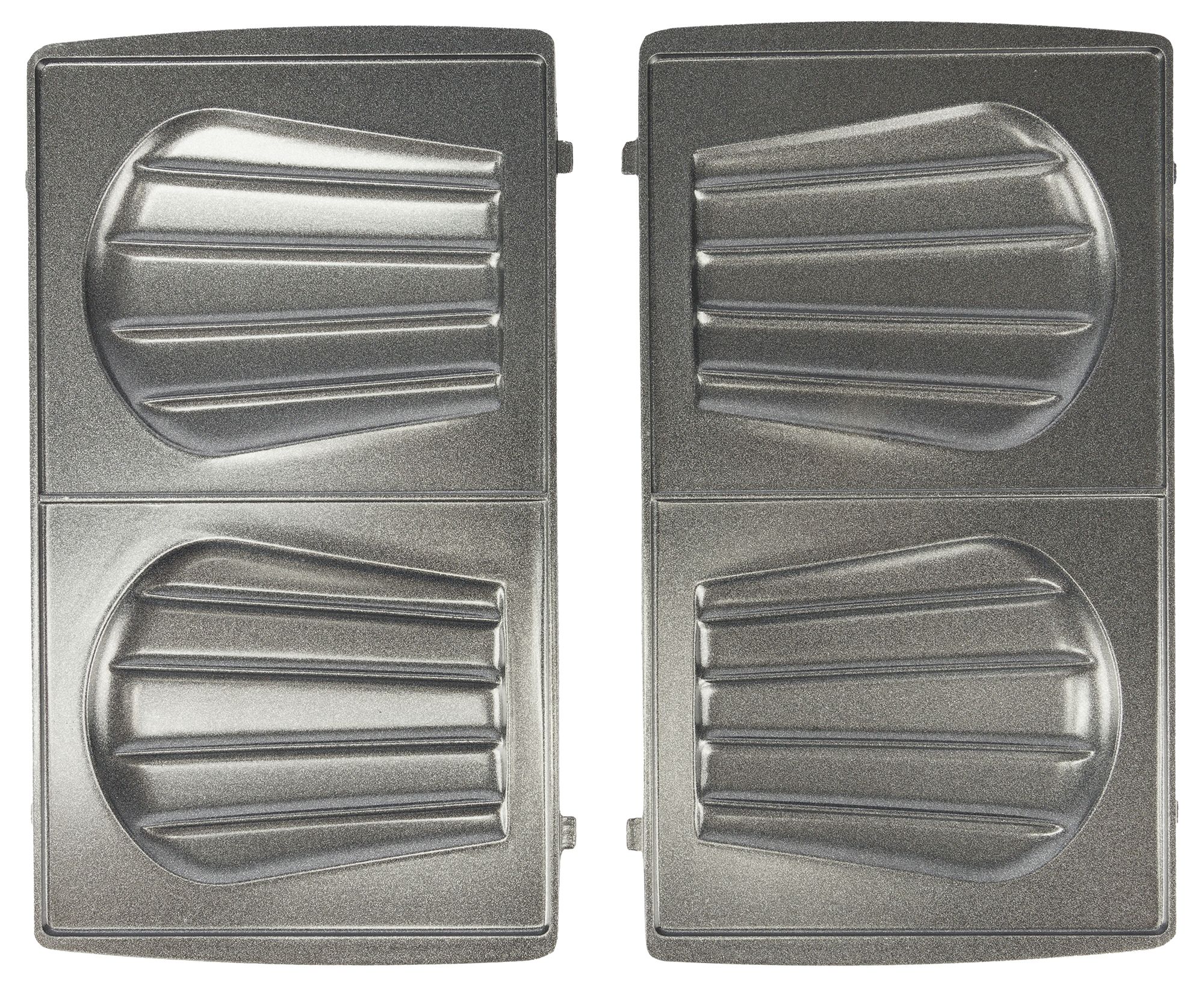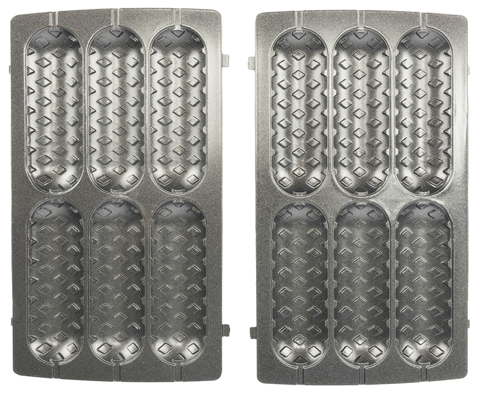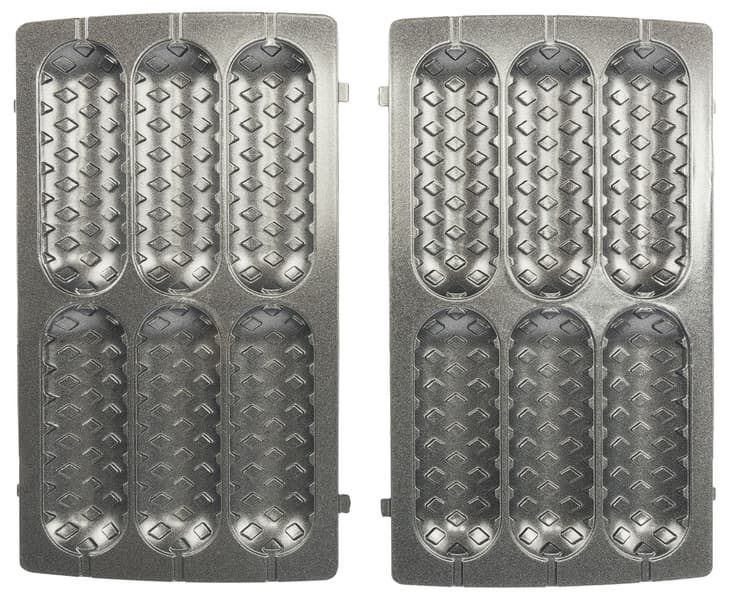Все сменные формы состоят из двух частей — верхней и нижней, и имеют антипригарное покрытие. На фотографии хорошо видны выпуклые боковые части, которыми формы фиксируются в приборе при установке.