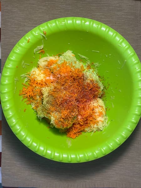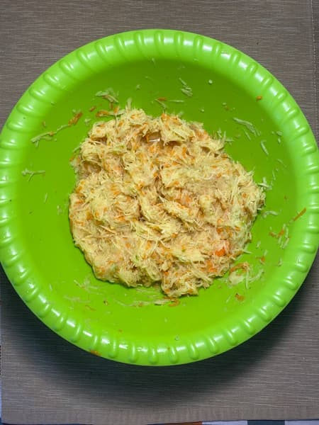 На мелкой терке натерли картофель, кабачок и морковь.