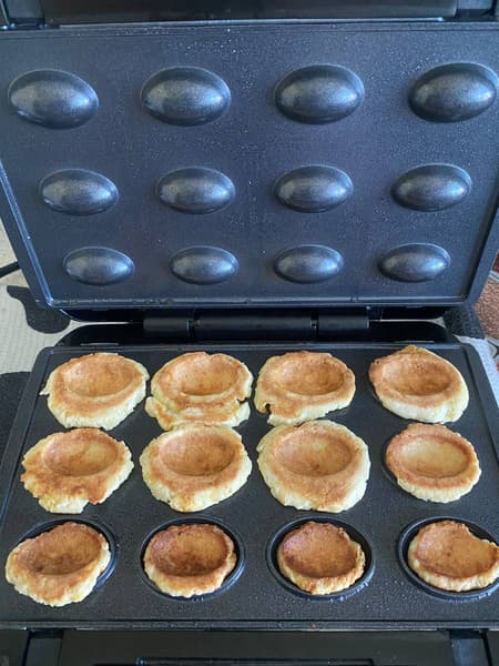 По инструкции, время выпечки — 5 минут. На практике показалось, что это многовато: первая партия слегка подгорела. Впрочем, на вкус это не повлияло, только на внешний вид — никакого горелого привкуса не было.