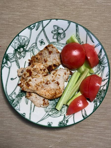 Готовились они 7 минут. На фото ниже мы уложили их в одну тарелку вместе с приготовленным филе грудки индейки — и ужин готов.