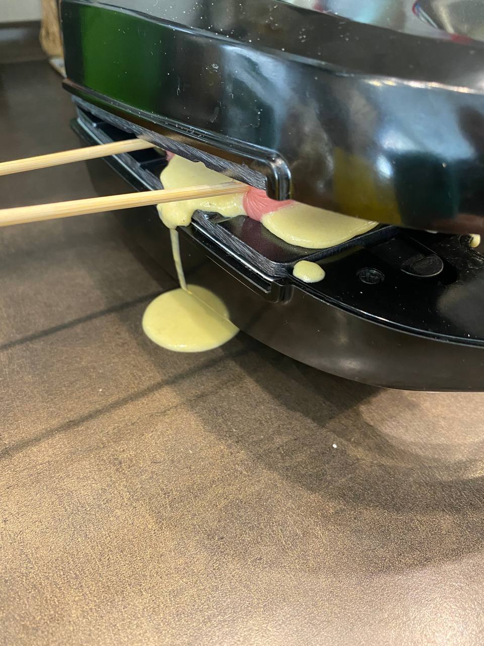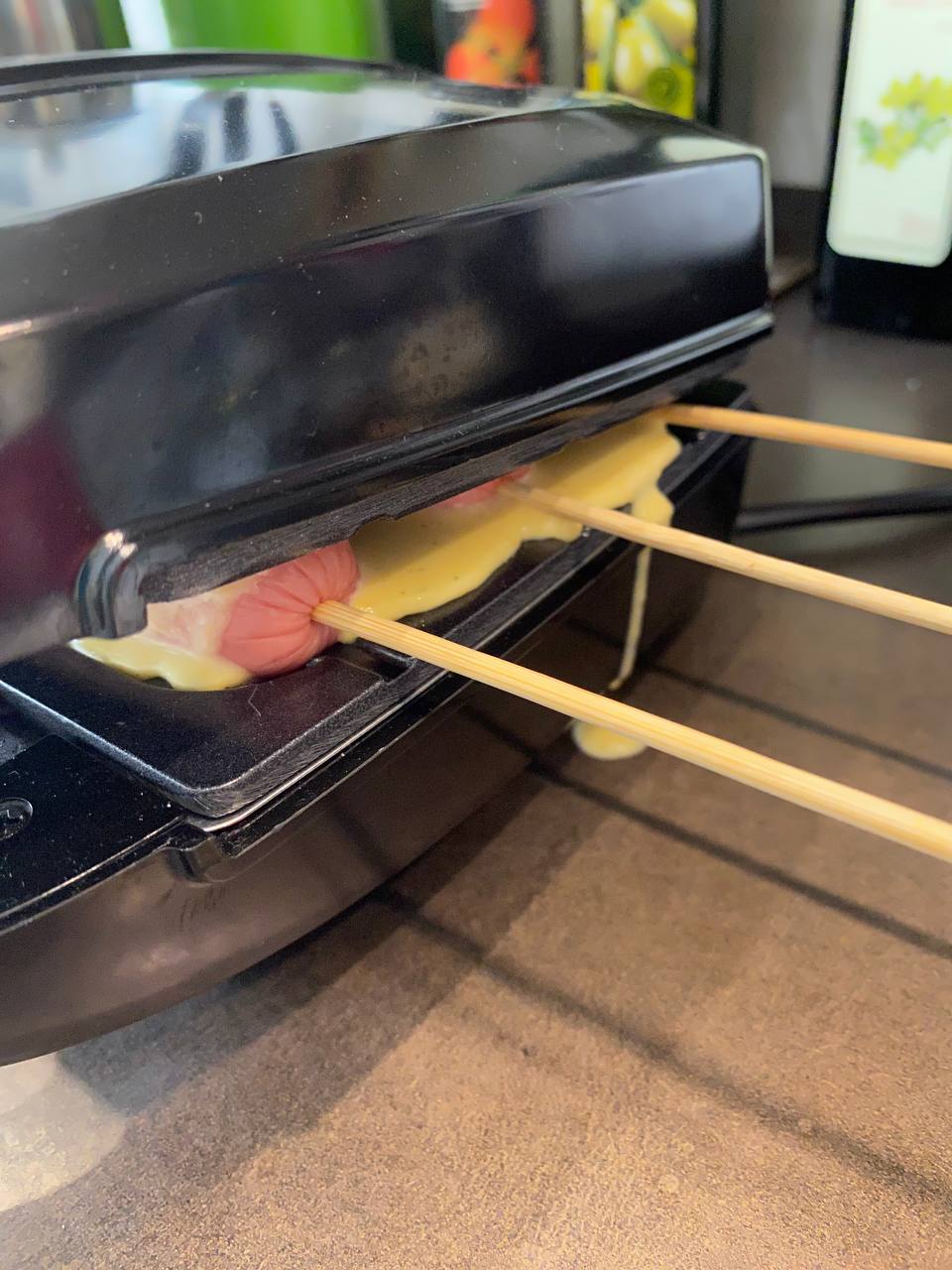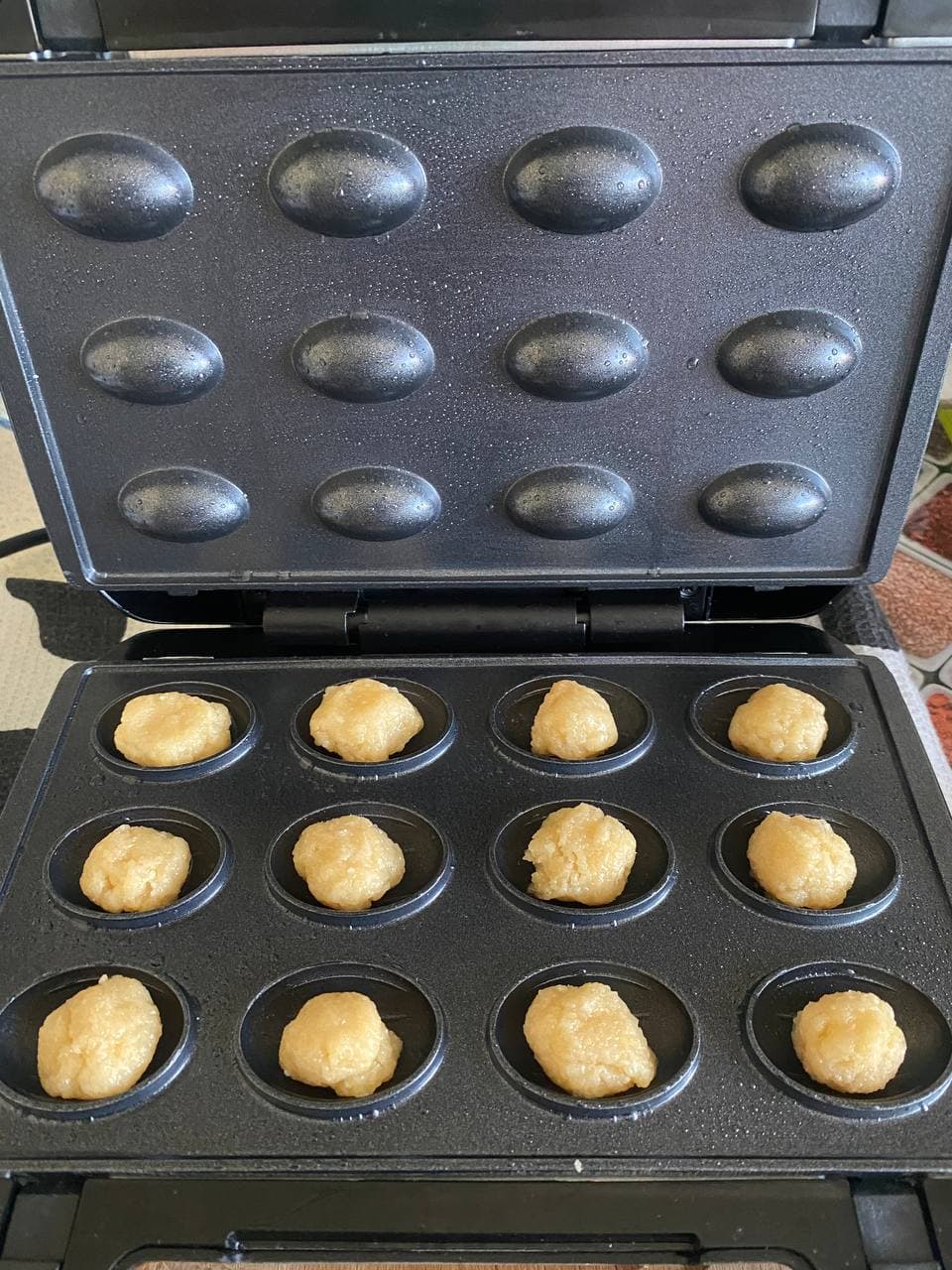 В первый раз тесто получилось слишком жидким. В нижнюю форму мультипекаря оно заливалось легко, но как только мы уложили сосиски и попытались полить их сверху, то масса буквально утекала мимо, переливаясь за края формы. В итоге излишки теста пролились по стенкам устройства и даже на стол.