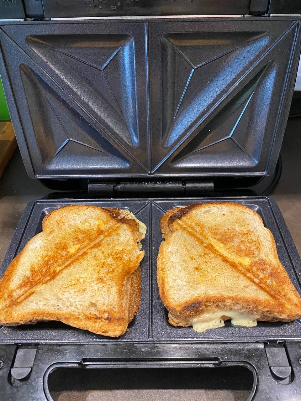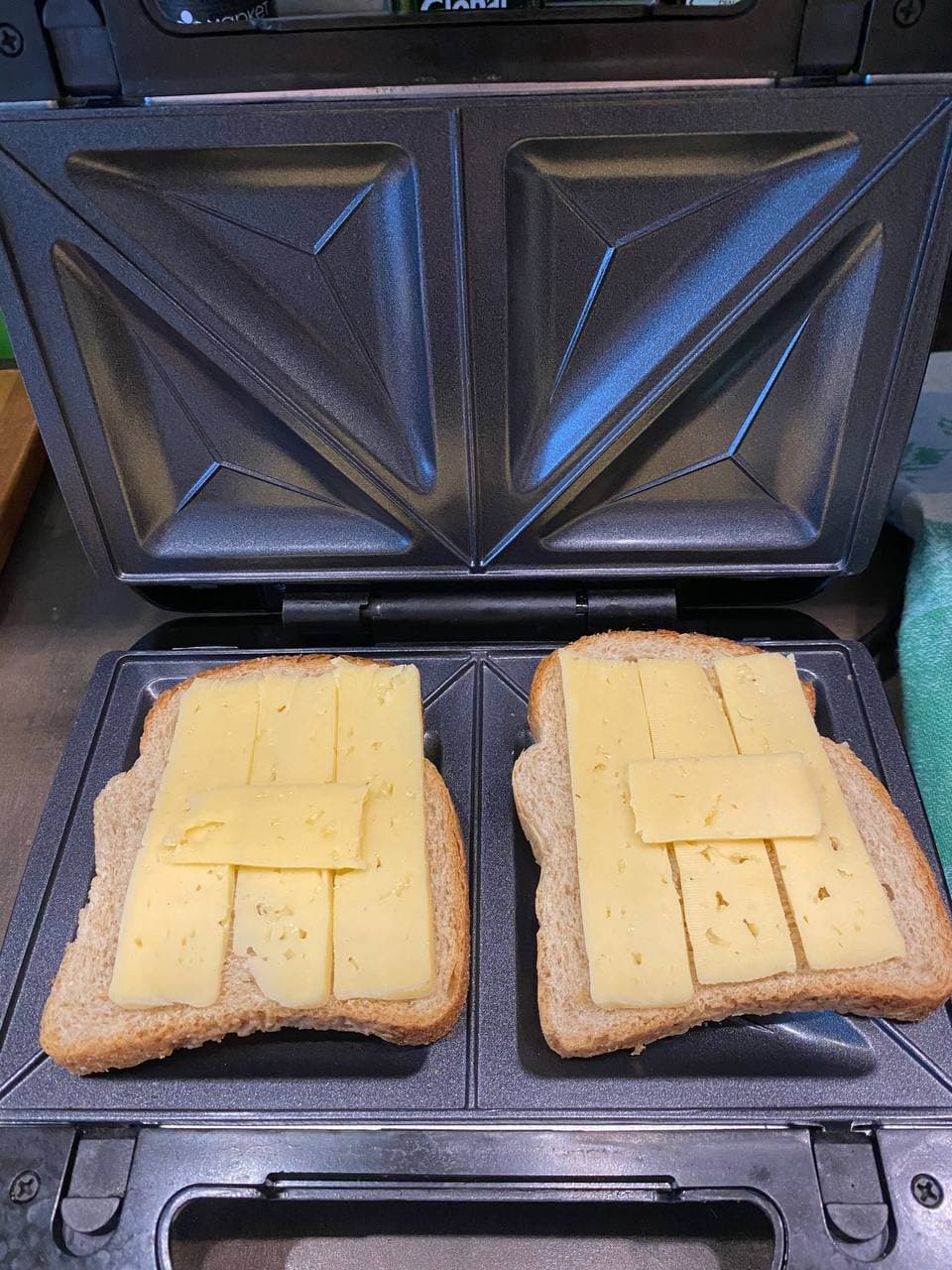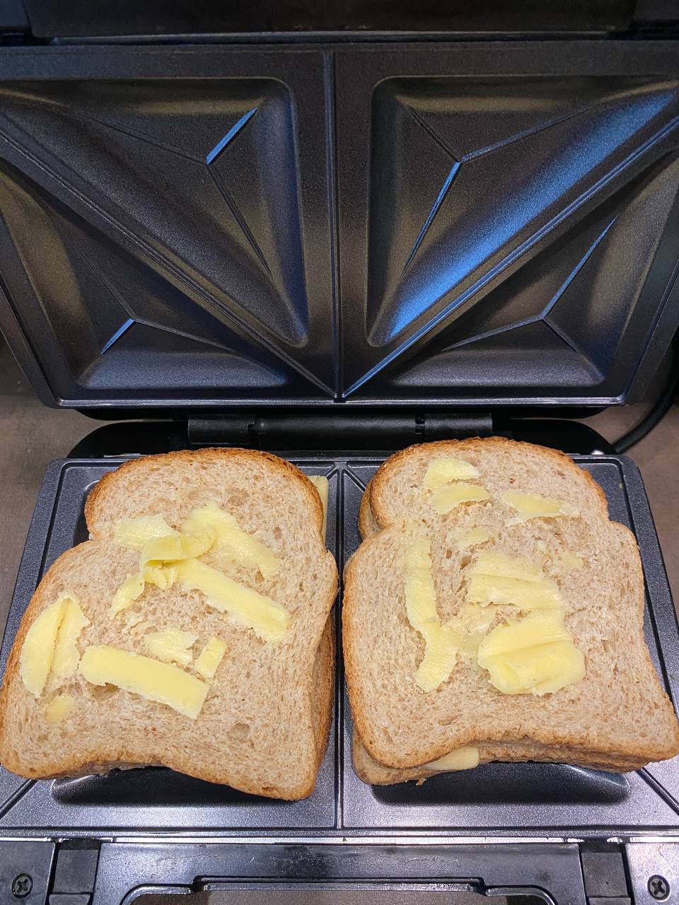 Использовали зерновой хлеб, а те стороны ломтиков, что будут соприкасаться с нагревательной поверхностью формы, смазали сливочным маслом. Внутрь положили сыр.