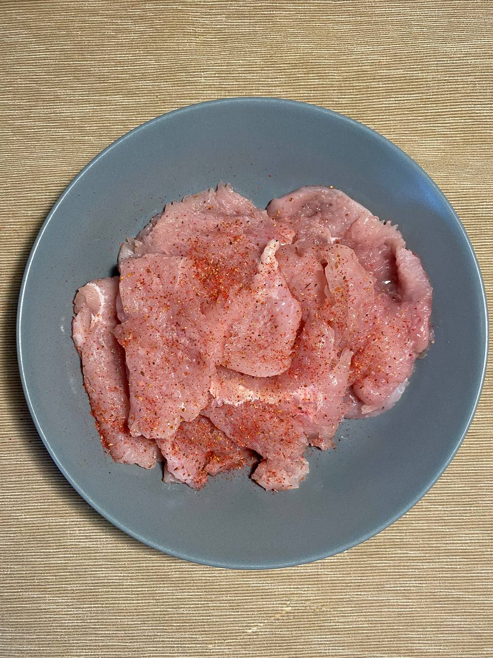 Филе порезали порционно, посолили, поперчили и слегка отбили.