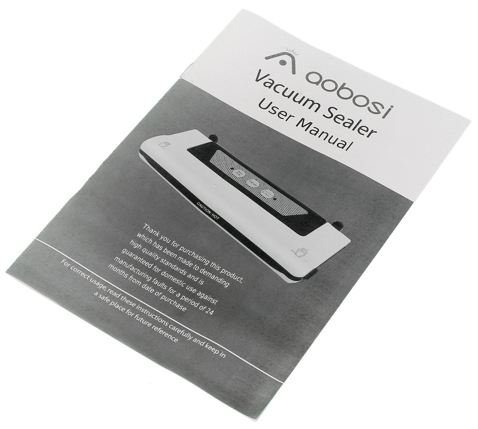 Инструкция к вакууматору представляет собой черно-белую мини-брошюру формата А5, отпечатанную на глянцевой бумаге. Естественно, никакого русского — только английский (и за то спасибо, что не китайский).