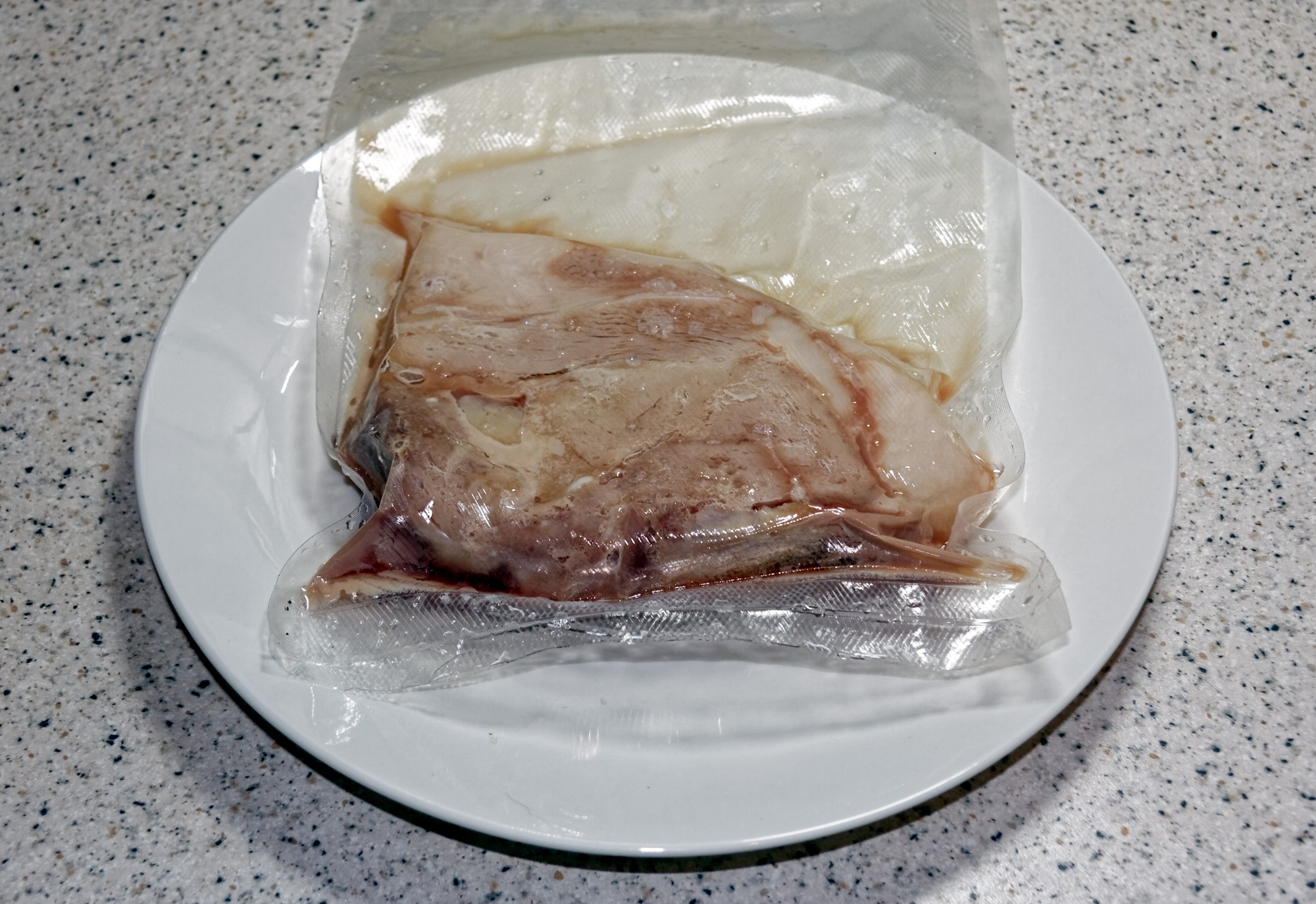 Филе трески солится и приправляется перцем, после чего отправляется в вакуумный пакет вместе с остальными ингредиентами. В оригинальном рецепте 350 граммов трески готовятся 30 минут при температуре 55 градусов.