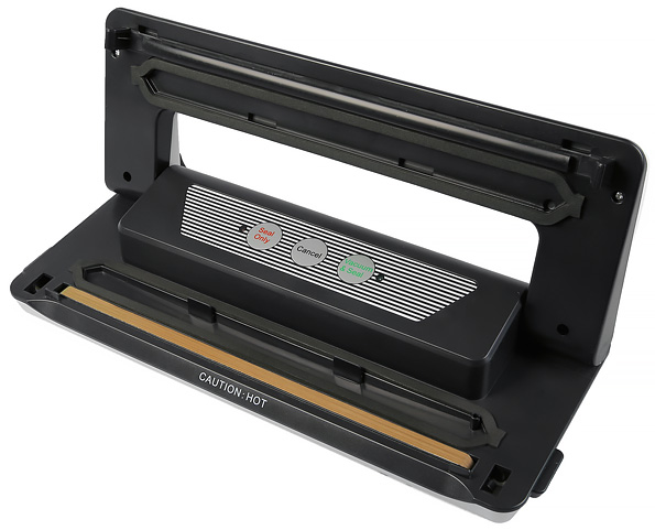 Верхняя часть вакууматора защелкивается при надавливании (потребуется приложить довольно заметное усилие). Чтобы открыть вакууматор нужно нажать две кнопки, расположенные по бокам прибора.