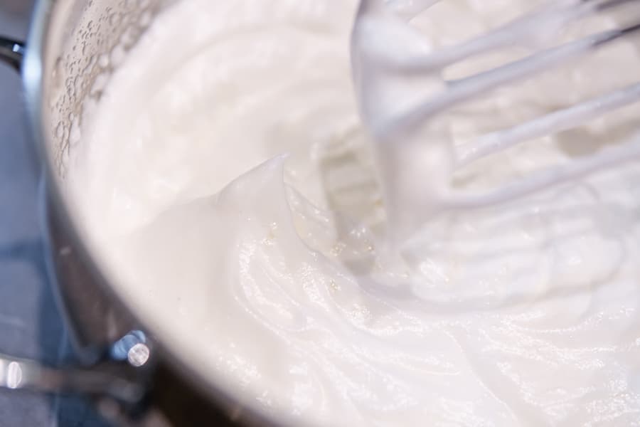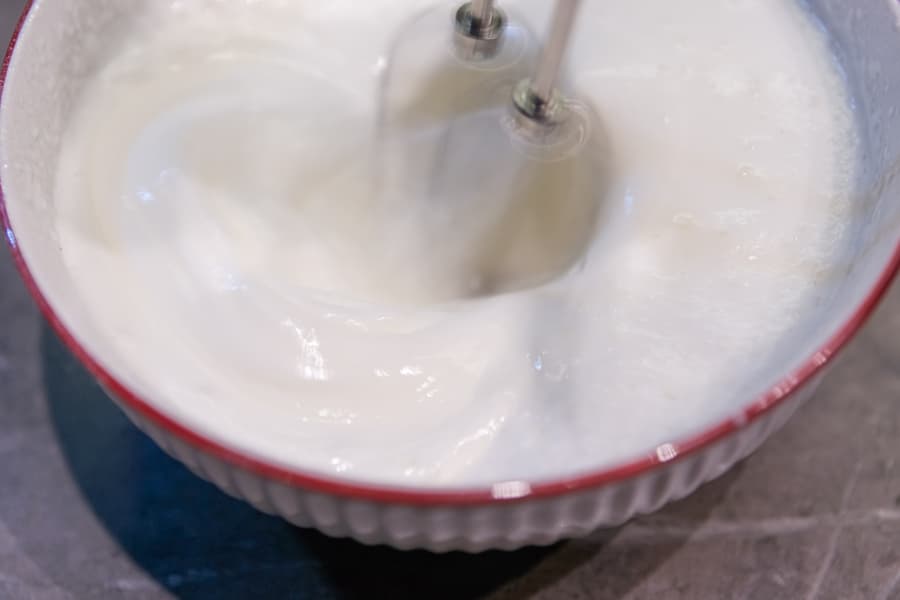 В емкость поместили 250 мл белков, в процессе добавив к ним сахар и щепотку лимонной кислоты.