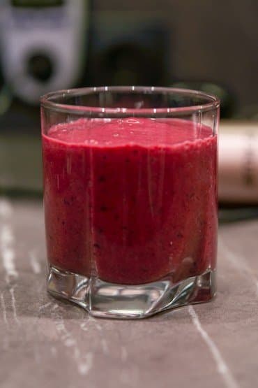Для приготовления смузи взяли два банана, добавили к ним 50 мл молока и около 300 г черной смородины. За 35 секунд на первой скорости ингредиенты тщательно перемешались и хорошо измельчились.
